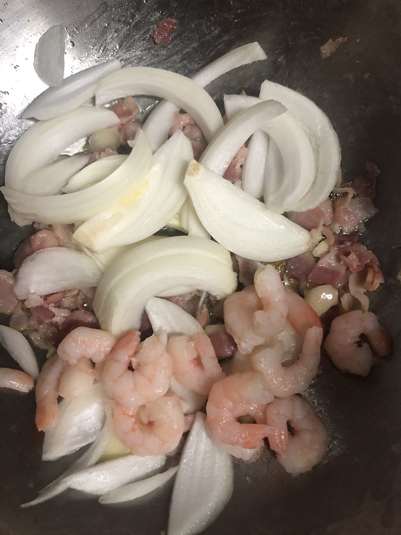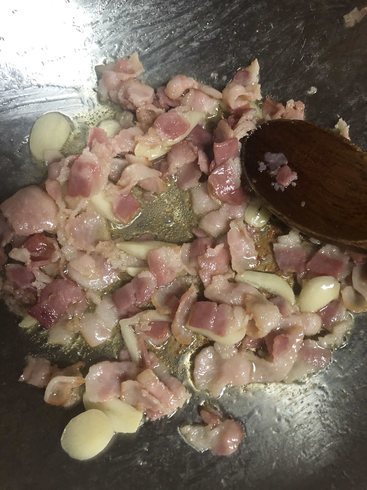 1. 중약불에서 올리브유를 두른 팬에 마늘과 베이컨을 볶아 기름에 마늘 베이컨 향이 베면, 양파를 비롯한 기타 재료를 넣고 강불로 볶습니다.