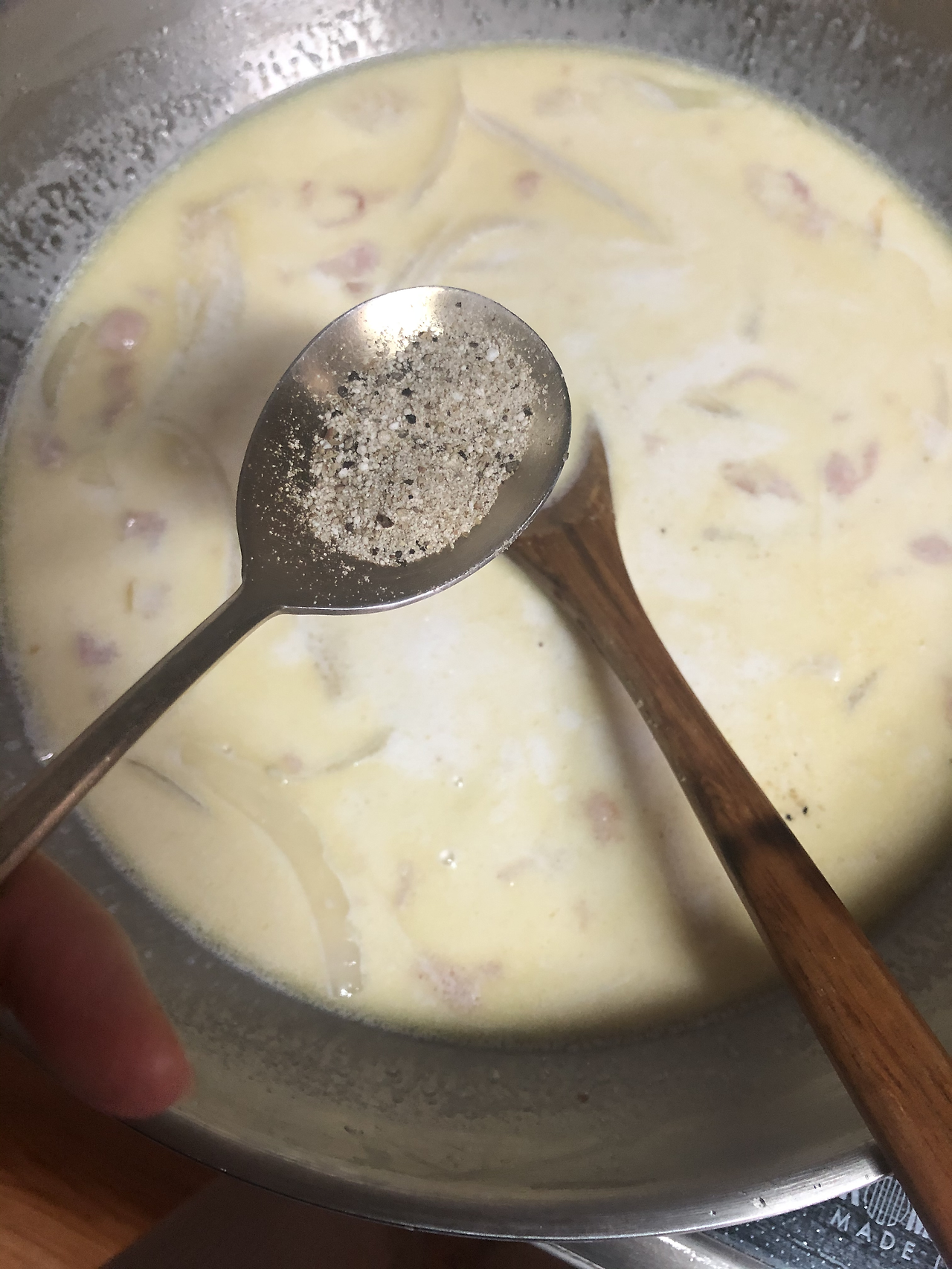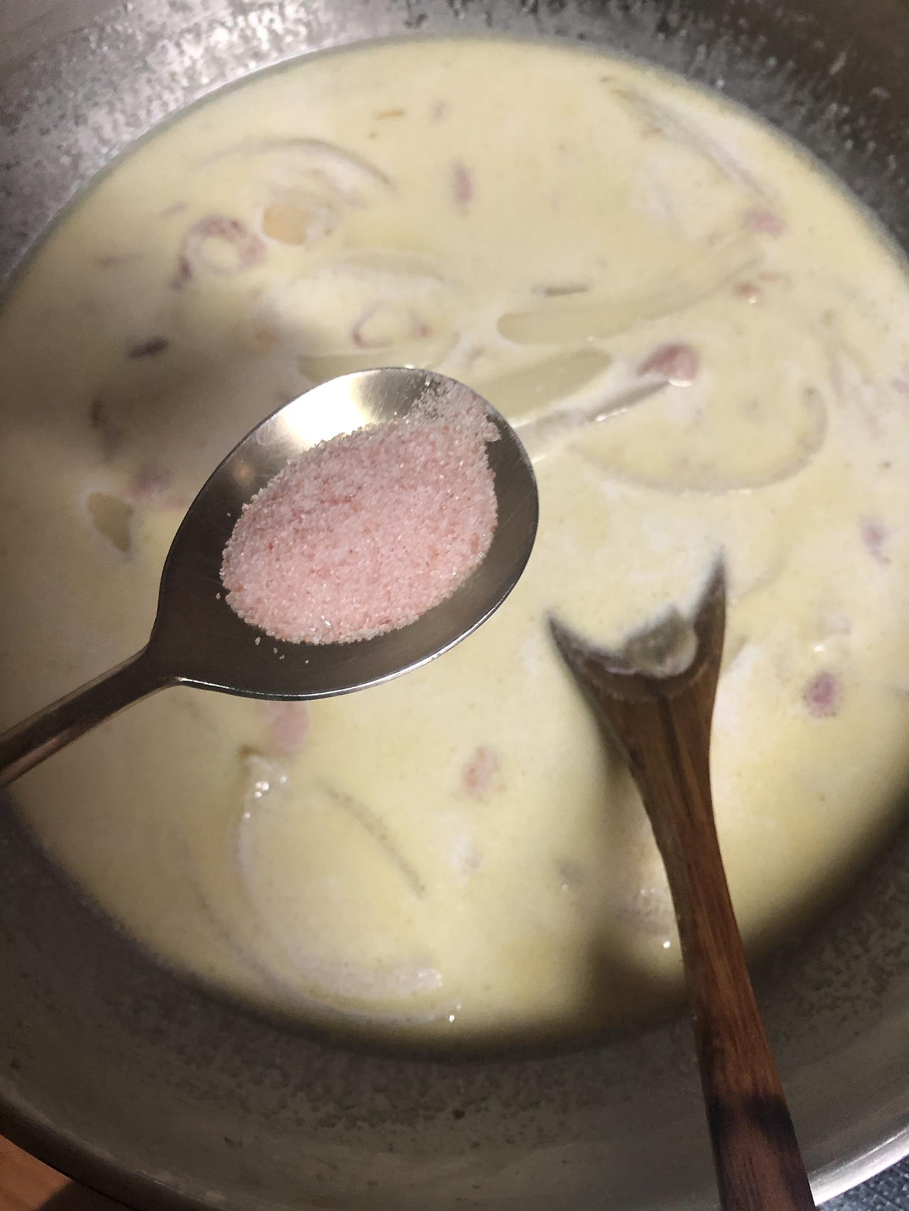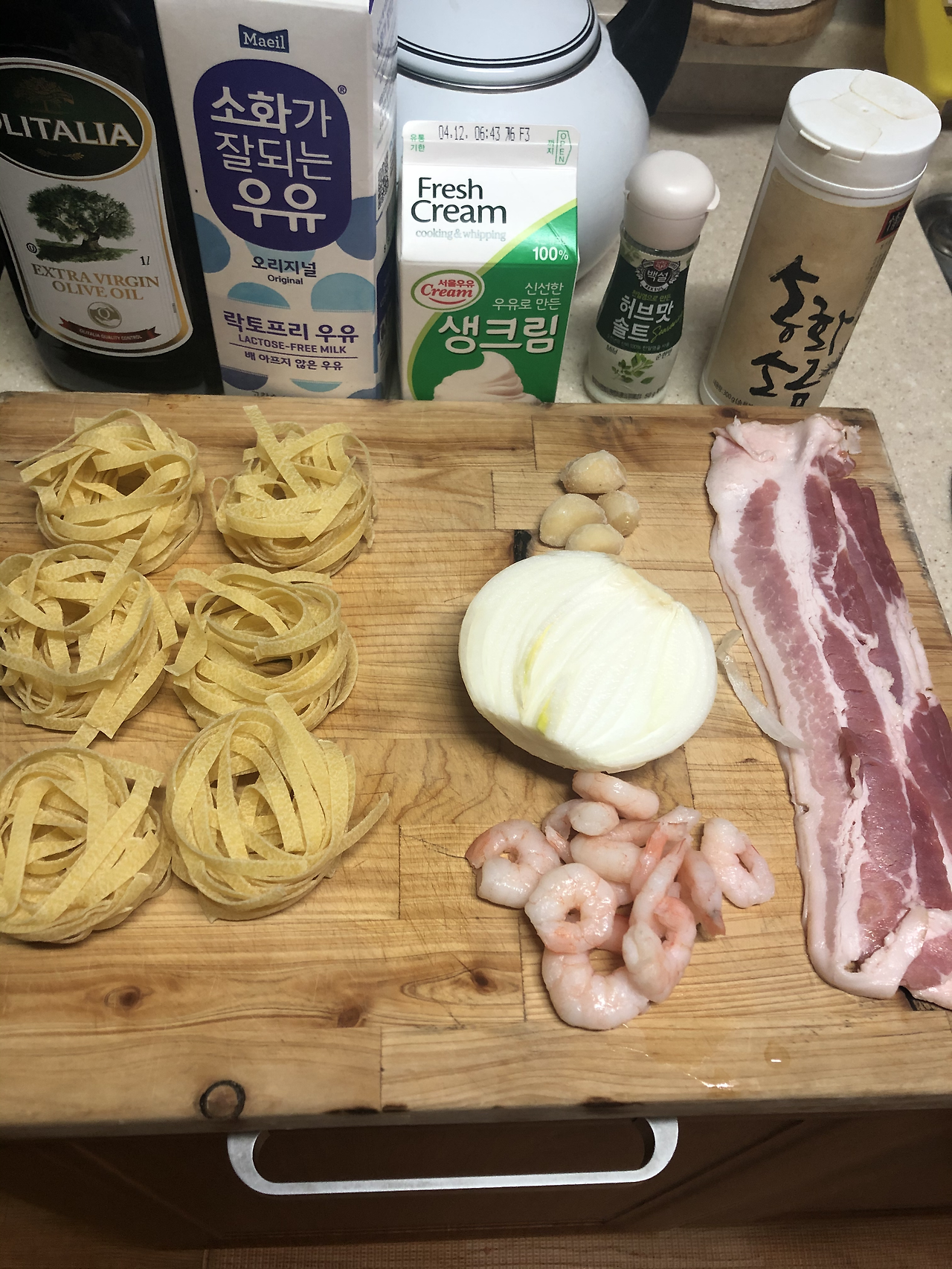 재료:파스타면, 올리브유, 양파, 베이컨, 소금, 허브솔트, 우유, 생크림
