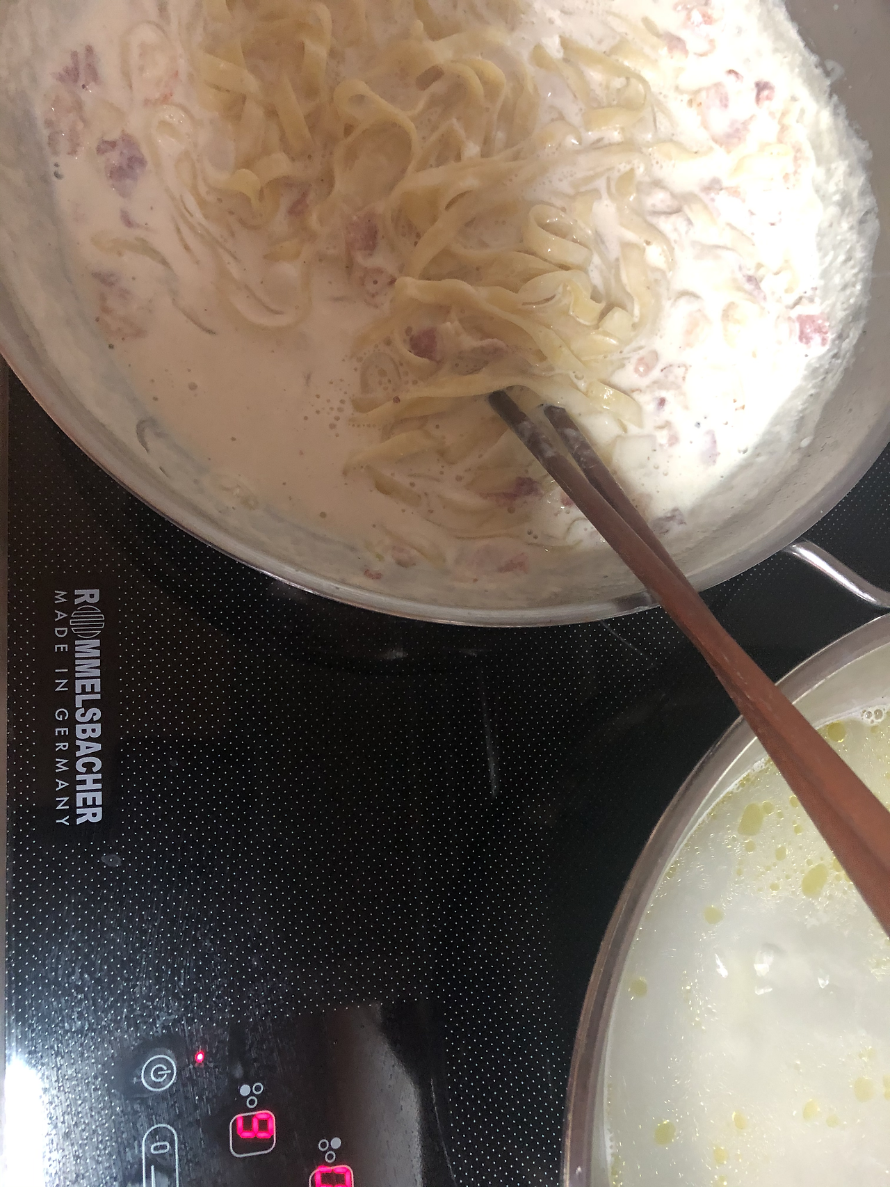 4. 크림소스가 끓기 시작하면 면을 삶겠습니다.