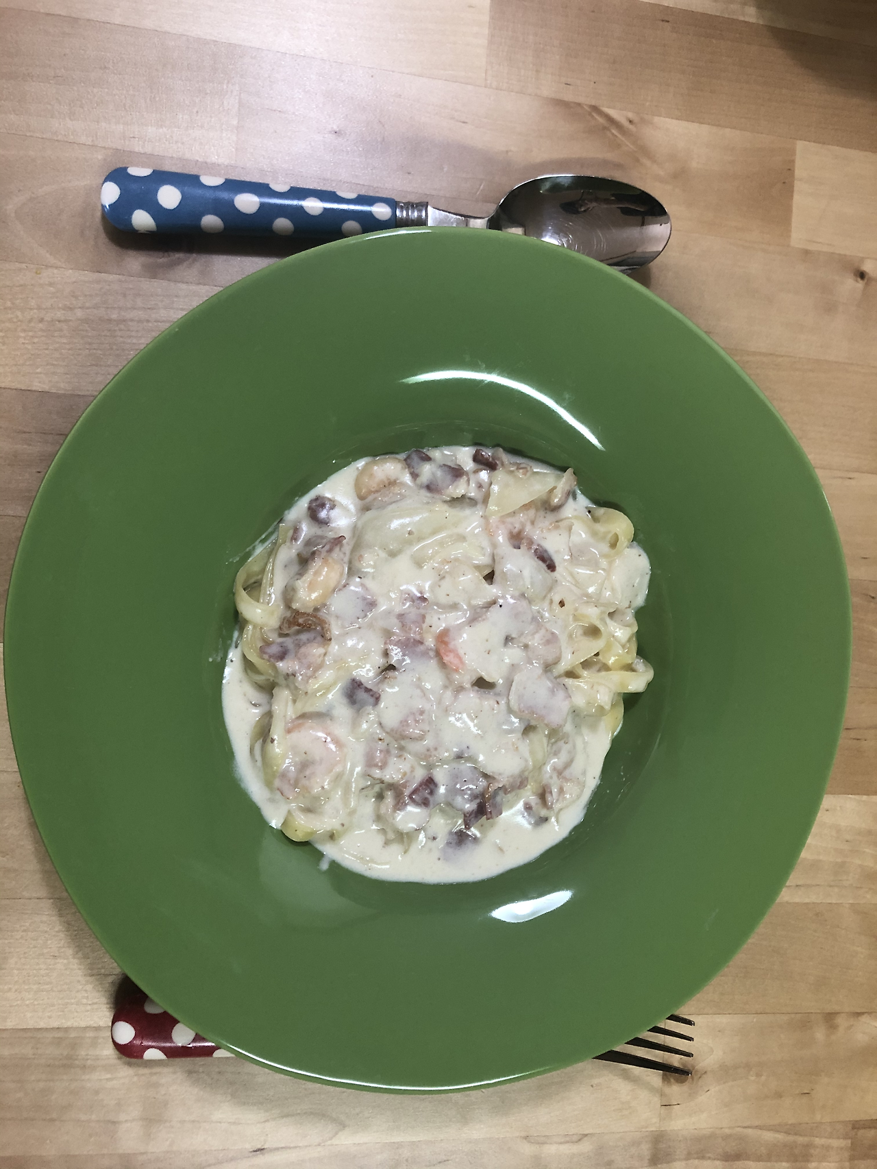 모 프랜차이즈 식당에 가면 투움바 파스타라고, 크림소스 파스타 중에서도 인기가 많죠? 그 파스타에 쓰이는 칼국수같이 널찍한 면인 ‘따글리아뗄레’를 이용해서 비슷하게 만들어 보았습니다. 하지만 그냥 길쭉한 스파게티면, 꼬불꼬불한 후실리 등 파스타면이라면 모두 ok입니다. 익는 시간도 비슷비슷하더라고요.