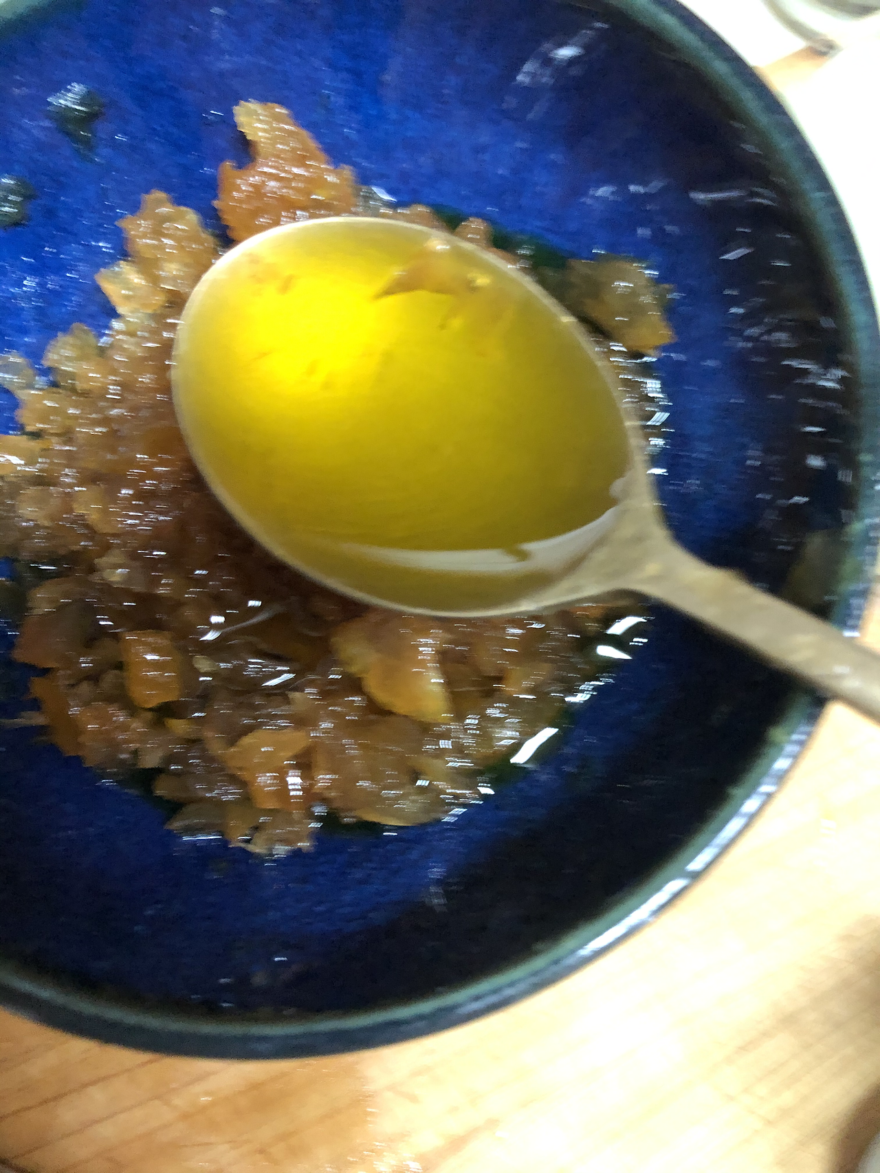 다진 유자청에 올리브 오일, 소금 약간, 향신료 약간을 넣고 섞는다.