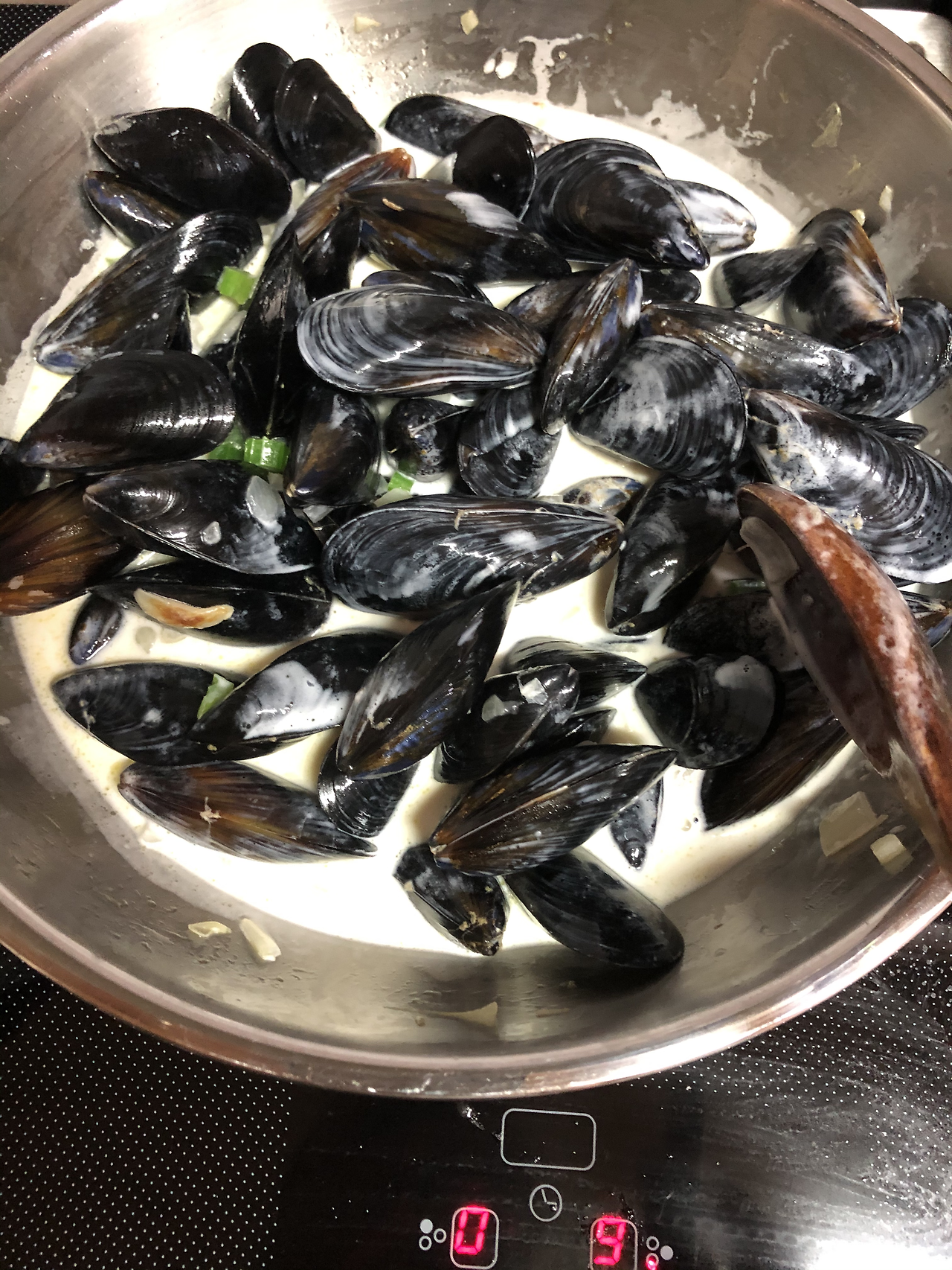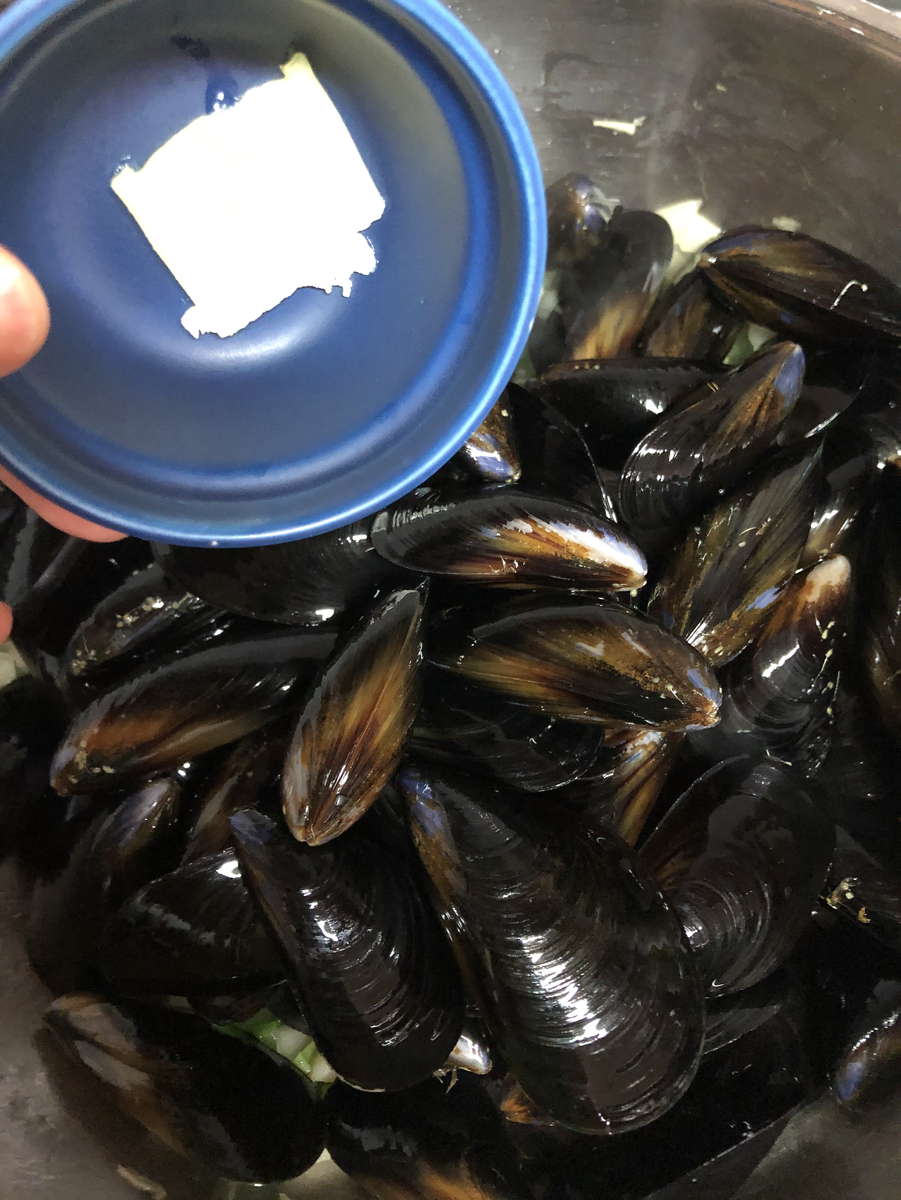 3. 양파가 익으면 깨끗이 손질한 홍합과 약간의 버터, 생크림 200ml, 달지 않은 주류 100ml을 붓고 알코올이 날아 가도록 뚜껑을 열고 끓입니다.