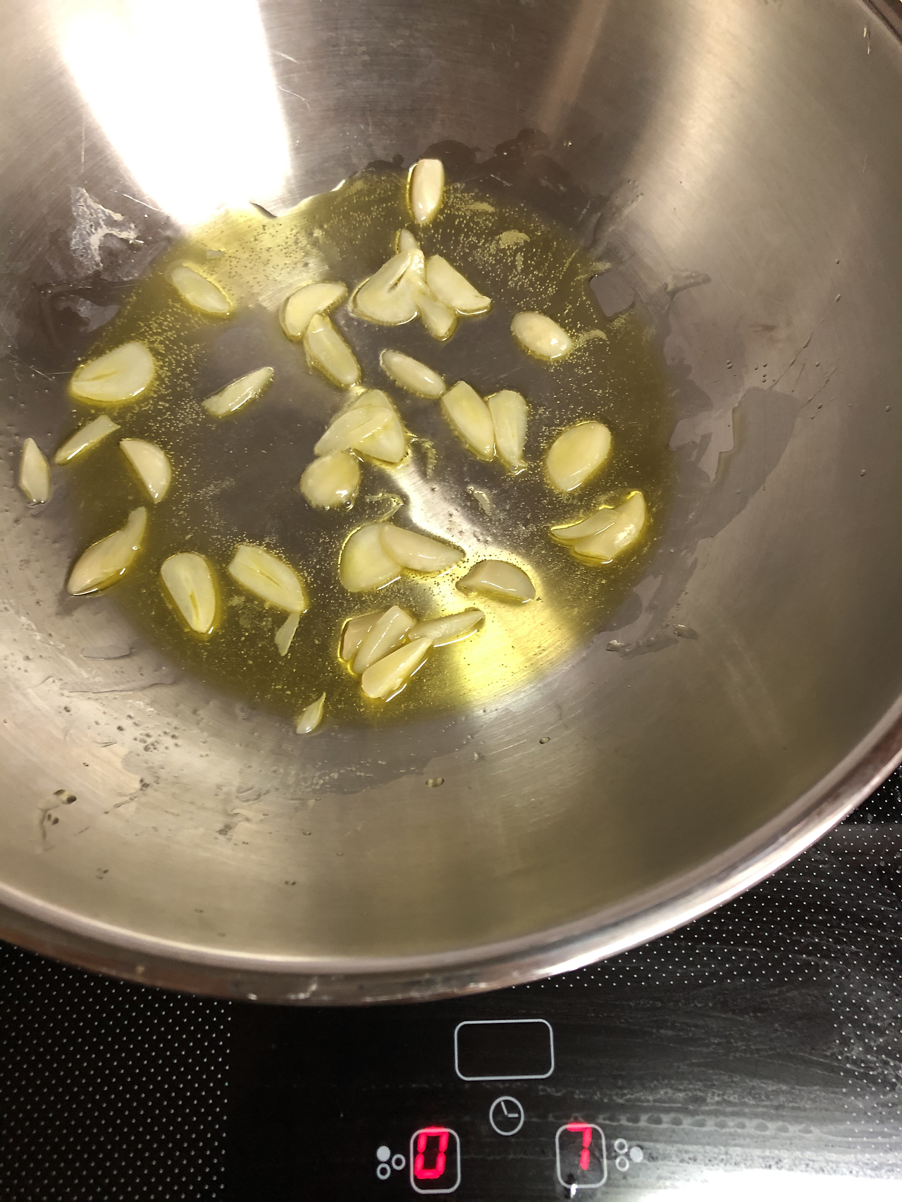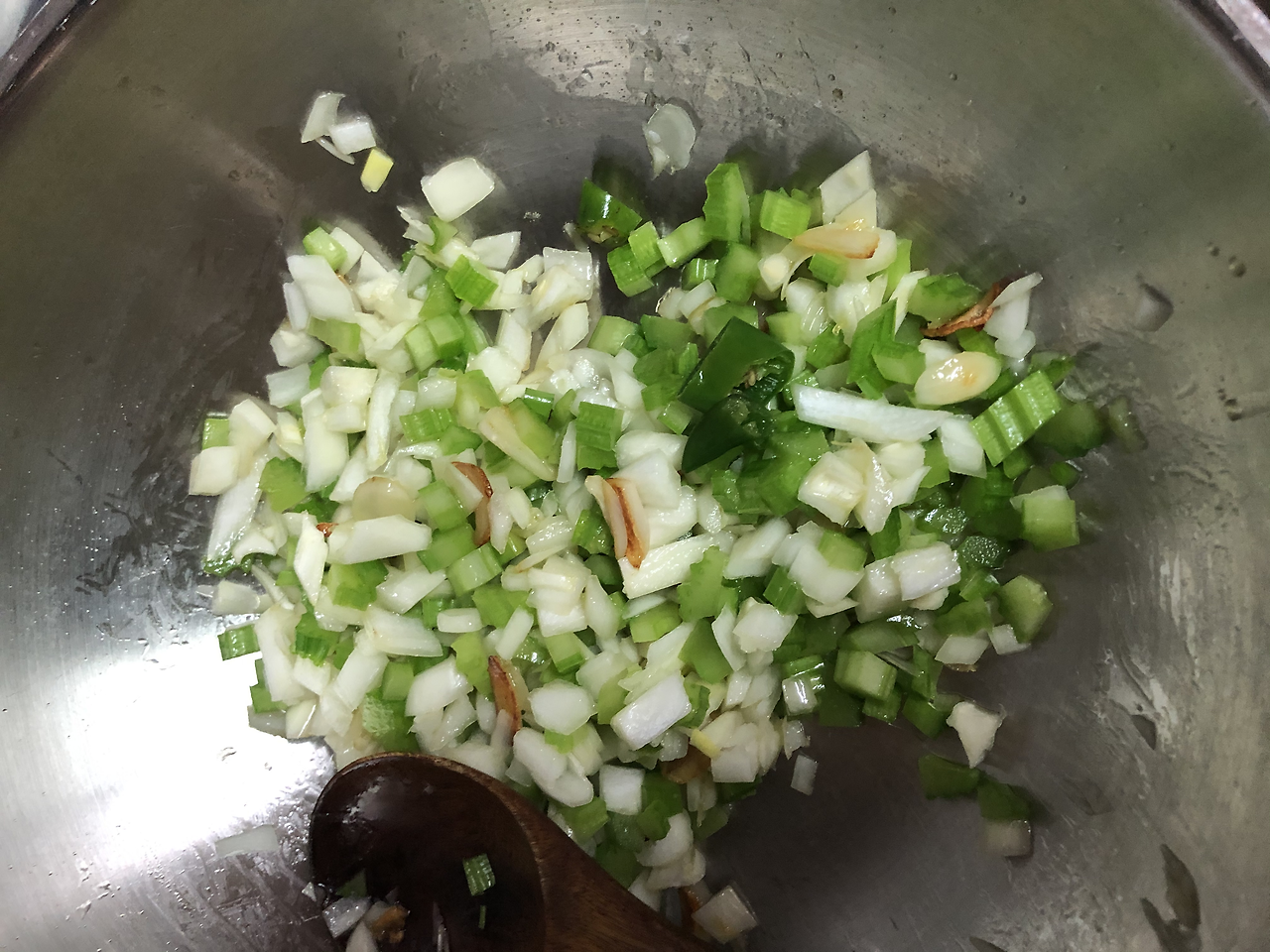 2. 올리브유에 마늘을 먼저 볶아 마늘향이 올라오면, 다진 양파와 샐러리, 매운 고추(청양고추, 페페론치노, 베트남 고추 등)를 볶습니다.