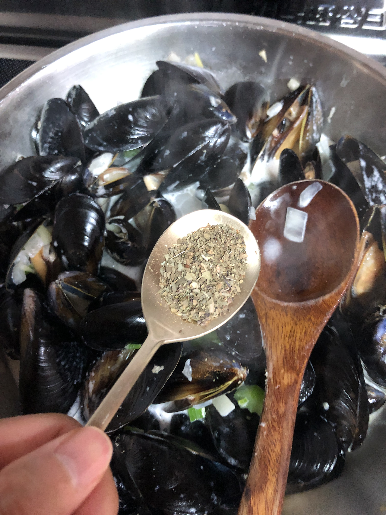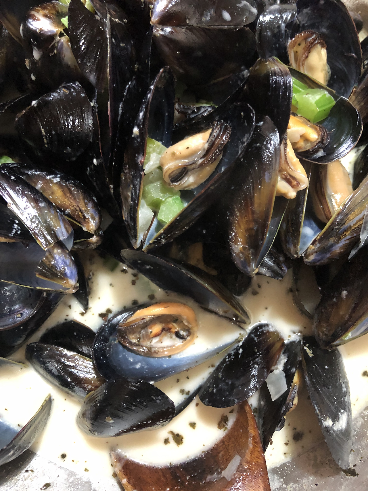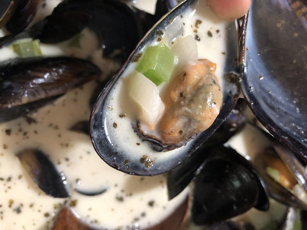 재료: 홍합 1kg, 생크림 200ml, 달지 않은 화이트 와인(소주, 청하 등도 가능) 100ml, 양파 1/2개, 샐러리 2줄기, 마늘 약간, 매운 고추 적당량, 허브솔트, 버터, 파마산 치즈, 바질