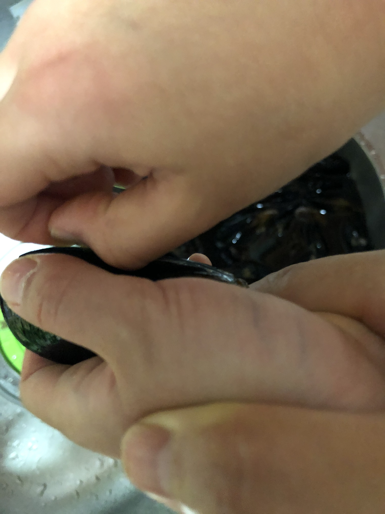 1. 먼저 홍합이 잠기도록 물을 붓고 30분간 담가 둡니다(해감이라고 하죠). 홍합에 붙어 있는 불순문을 뜯어내고, 6~7회 빡빡 문질러 씻습니다.