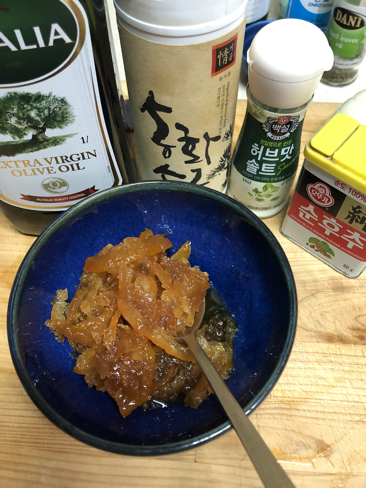 그래서 해감하는 동안 샐러드 소스 만들어 보았습니다. 겨울 동안 먹다 지쳐 남은 유자청을 소모하였습니다.