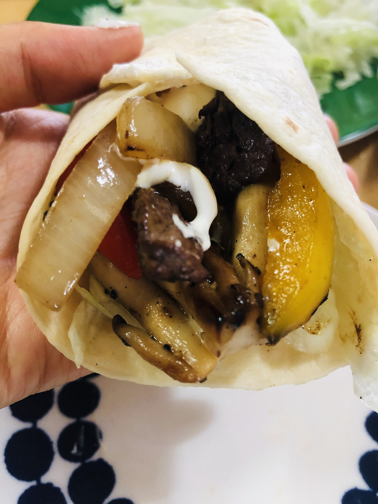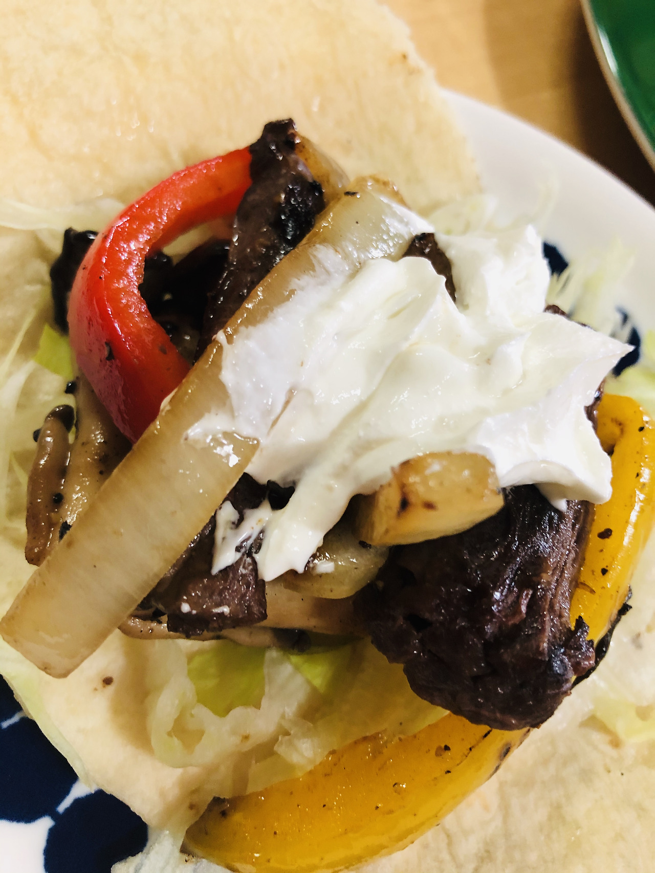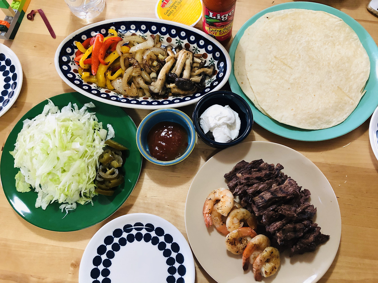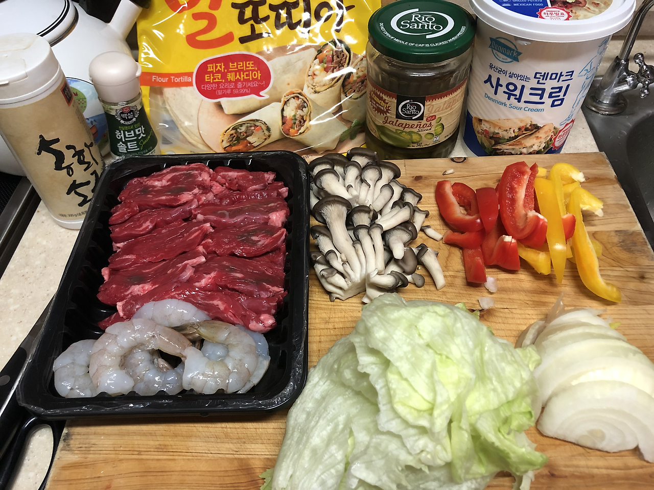 재료(2인분): 쇠고기 300g, 새우 약간, 피망 1개, 양파 1/2개, 버섯 약간, 양상추, 허브 솔트, 소금, 토르티야(또띠아), 사우어크림 등 소스, 할라피뇨(한국 고추장아찌 대체 가능) 선택