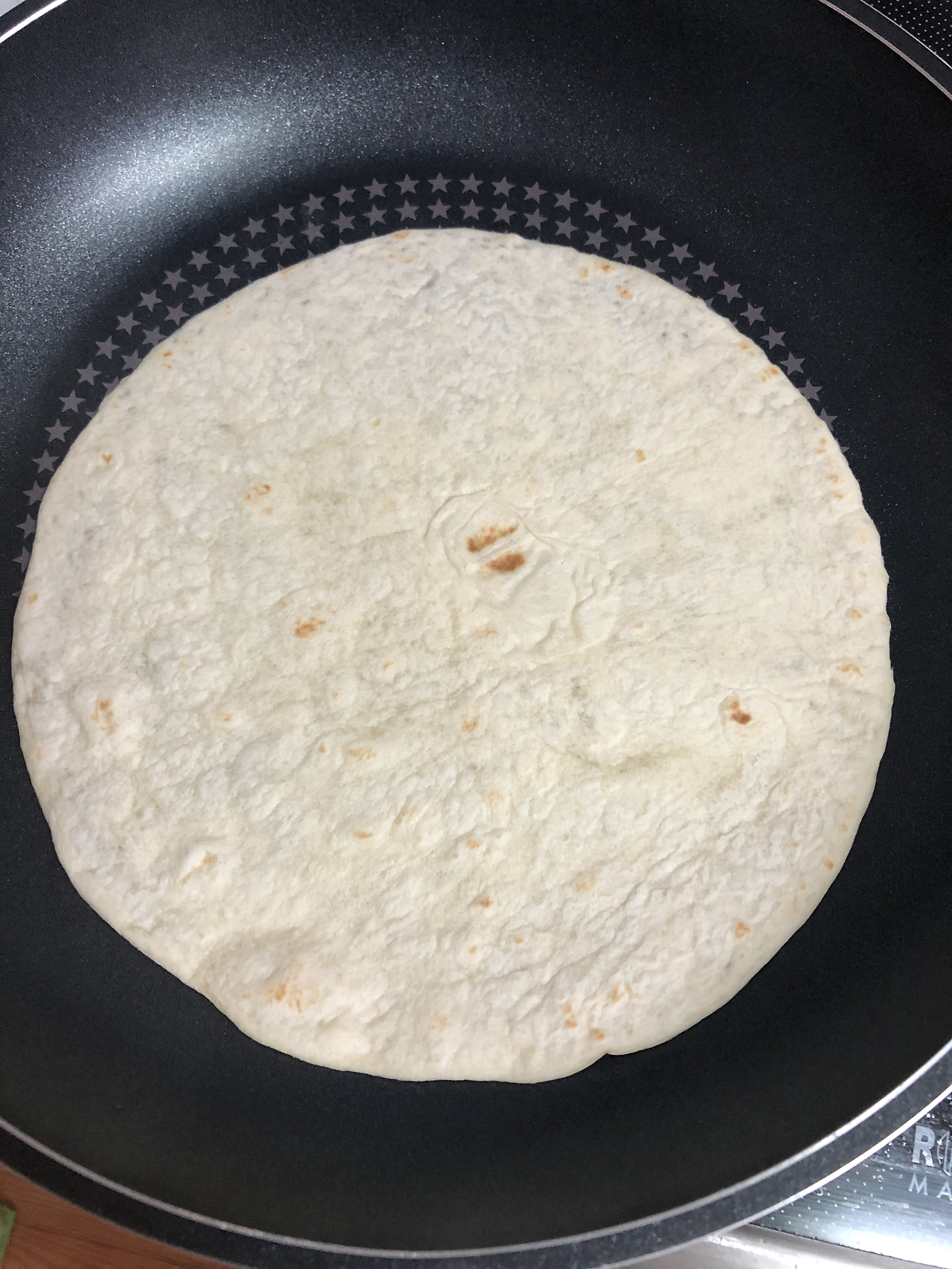 4. 토르티야(또띠아)를 중불, 프라이팬, 물을 약간 두르고 아주 살짝만 데웁니다.