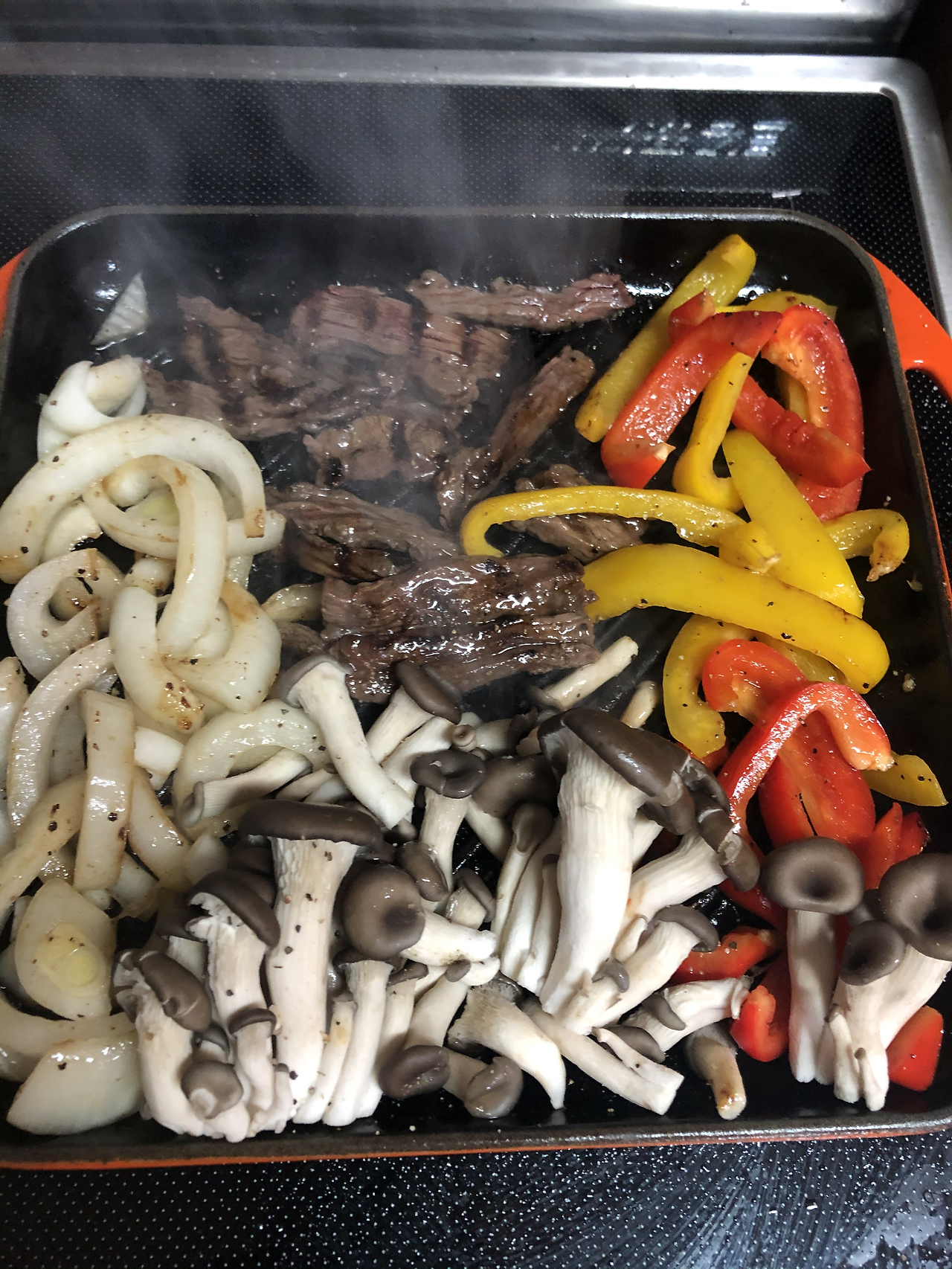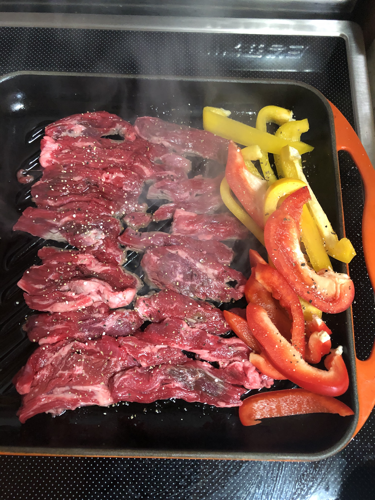 2. 팬을 달구고 고기와 채소를 굽겠습니다. 고기와 채소 모두에 소금(+허브솔트 혹은 후추)을 뿌려 굽습니다.