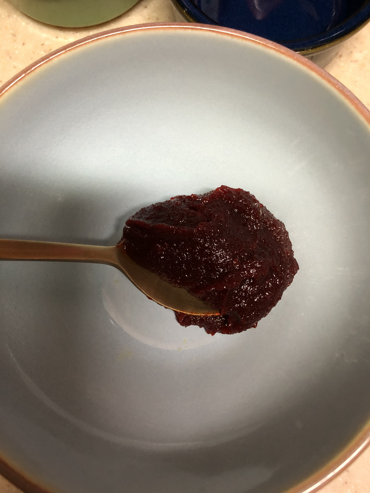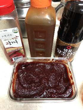 먼저 양념장을 만들어 보겠습니다. 재료는 딱 4가지; 고추장, 고춧가루, 양조간장, 매실액입니다. 이 양념들을 1:1:1:1로 섞습니다. 참고로 저는 고기 500g 기준, 어른 밥숟가락으로 2스푼씩 했습니다. 요리꽝손에게 정확한 계량은 사치이자 역부족이죠. 동일한 비율로 섞은 후 요리를 하면서 맵고 싶으면 고춧가루를, 짜고 싶으면 간장을, 달고 싶으면 매실액이나 올리고당 등 당류를 첨가합시다. 실패를 막을 수 있는 안전한 조치입니다.