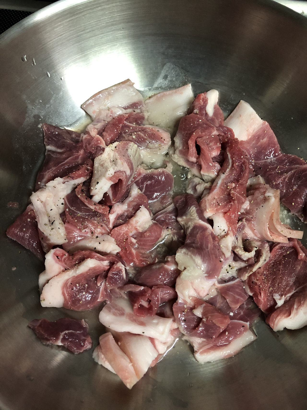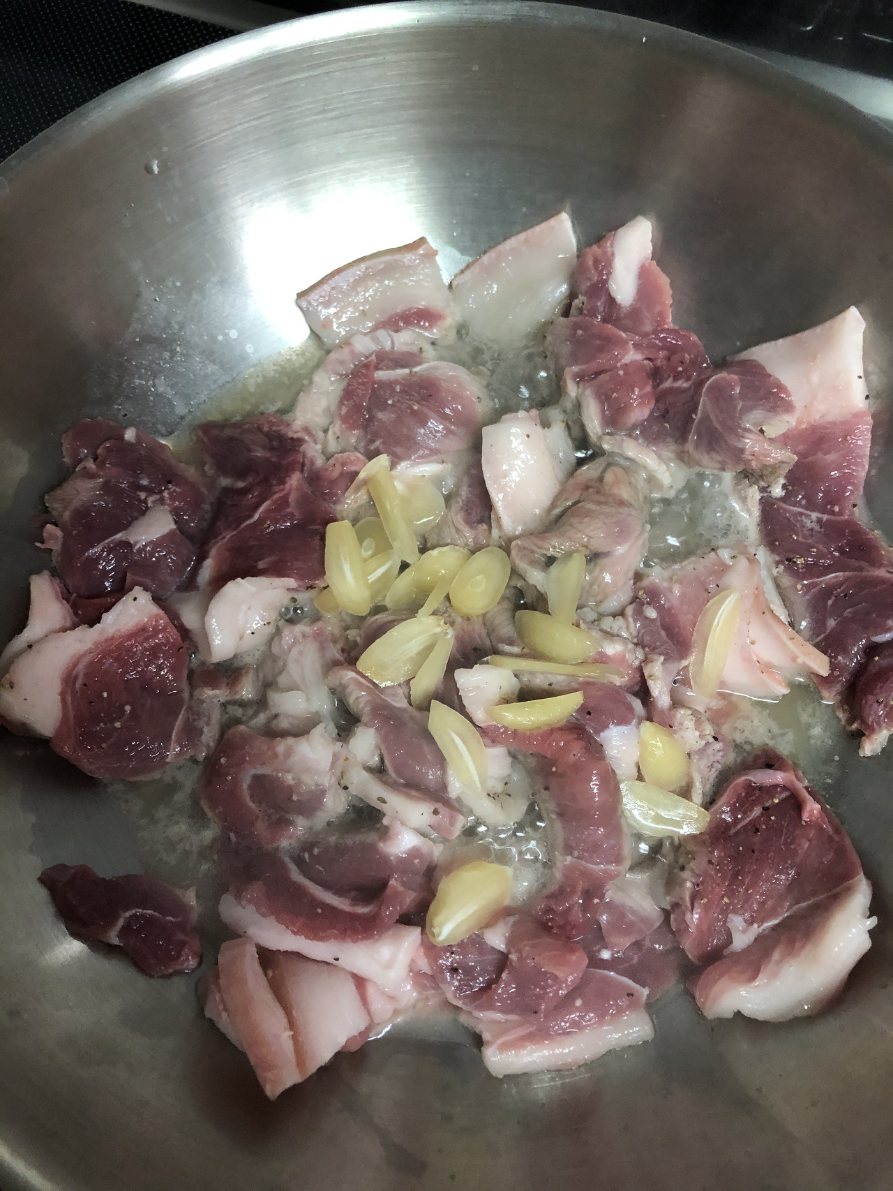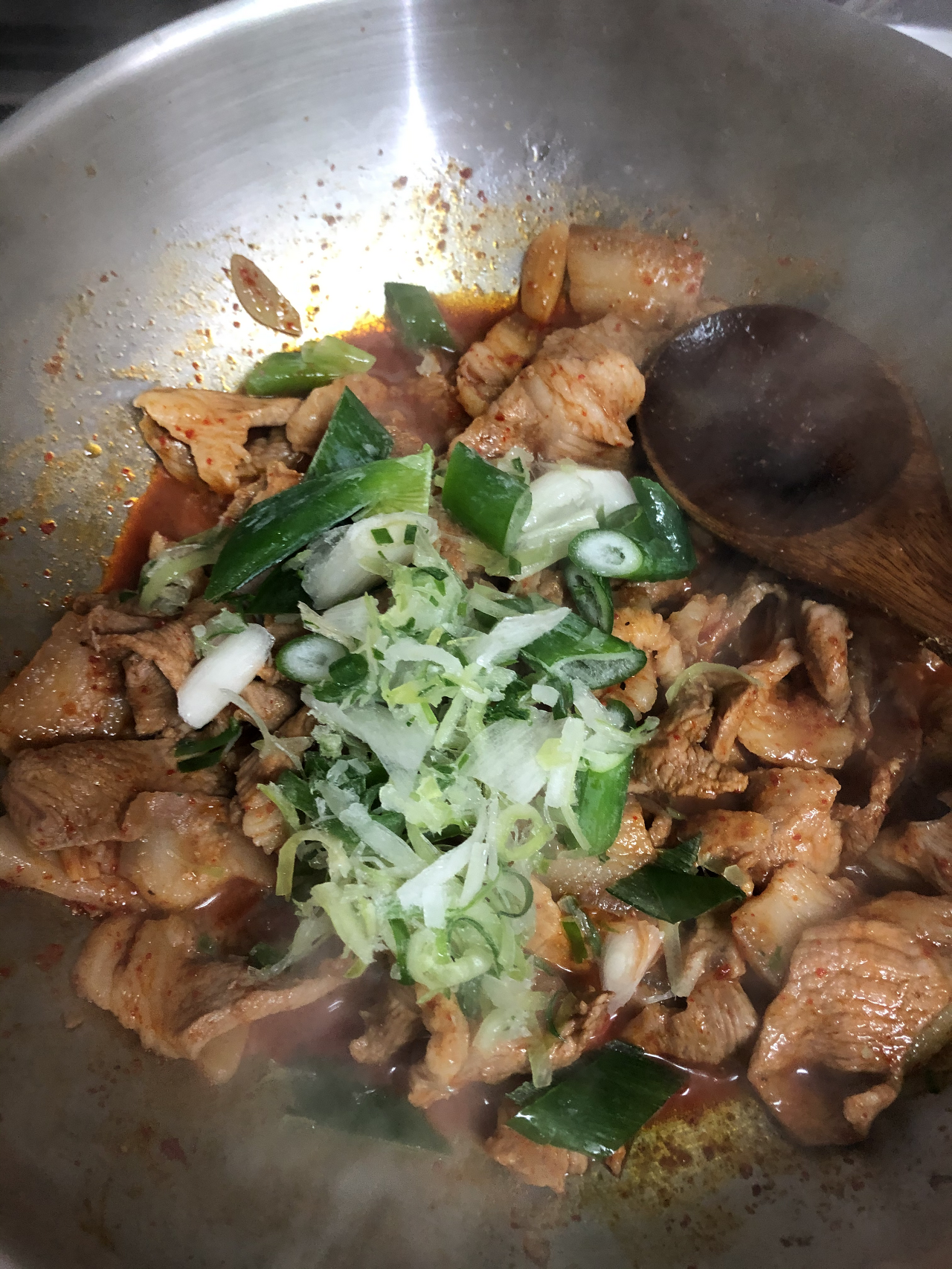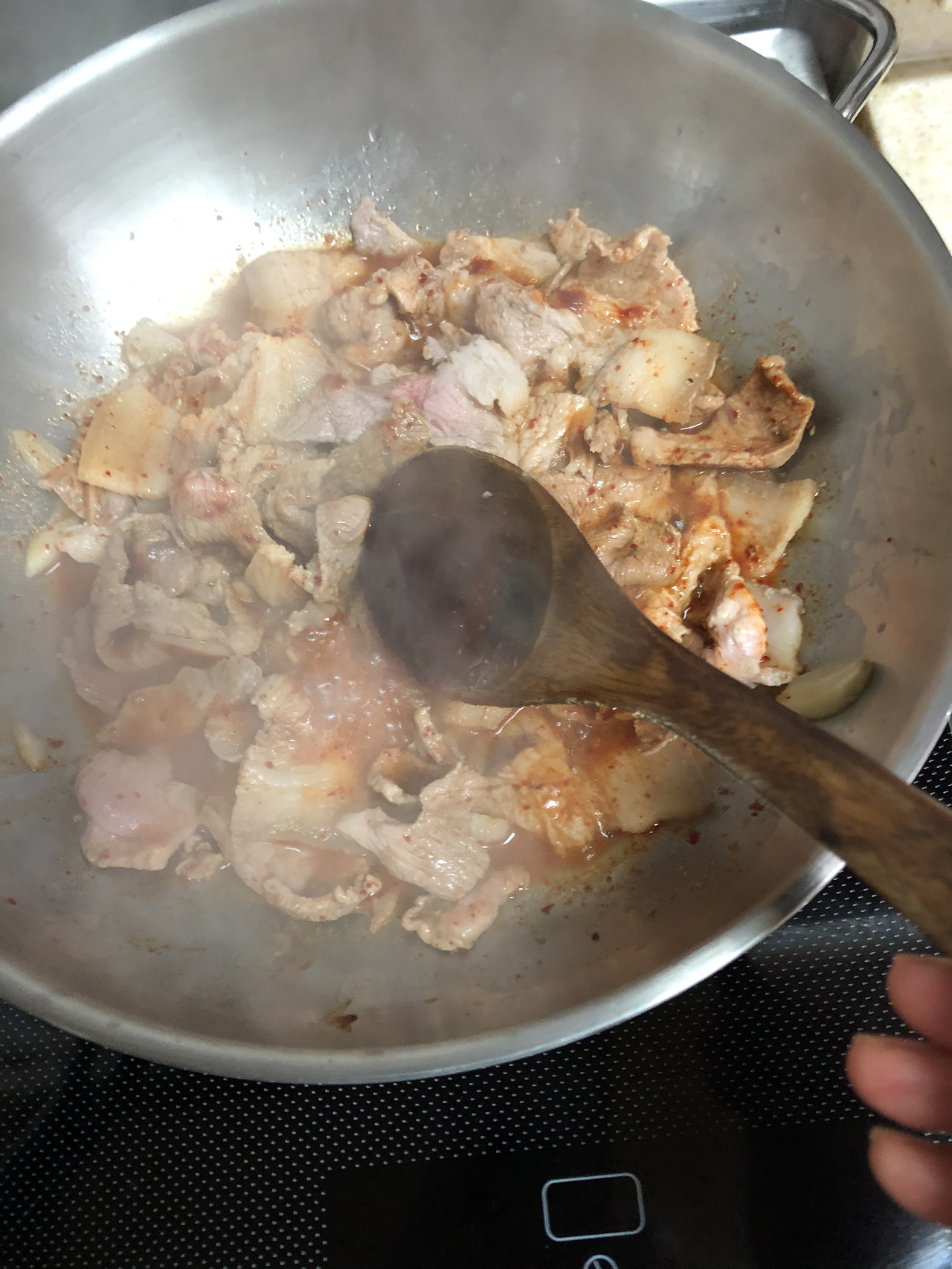물 100ml 정도를 끓이다 물이 끓으면 고기에 편 마늘을 넣고 익히다, 고기의 붉은 기가 조금 남았을 때 양념을 2숟가락 정도 넣고 더 익힙니다. 고기가 다 익었다 싶으면 간을 봅니다. 맵단짠 중 추가하고 싶은 맛의 장류를 더합니다. 그 후 양념이 타지 않도록, 물이 부족하면 물을 더 붓고 졸여갑니다.