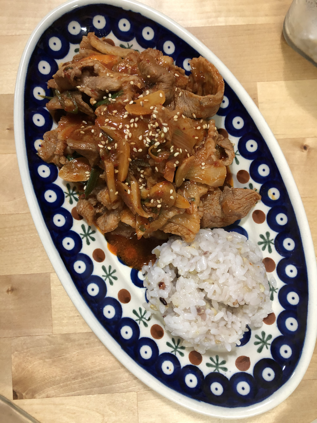 밥을 밥그릇에 담아 뒤집으면 동그랗게 세팅할 수 있습니다. 깨가 있으면 제육볶음 위에 뿌려 봅니다.