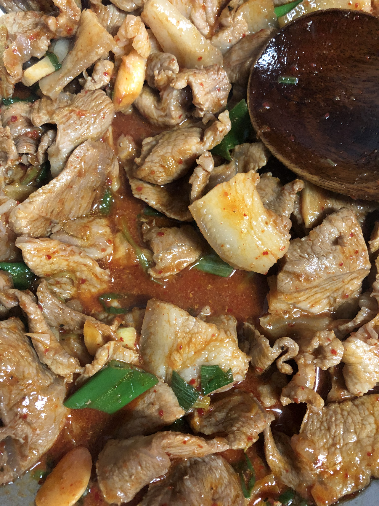 3. 국물이 노란 끼가 도는 웜톤 주황색이 되면 고기 기름이 배어 나온 맛있는 상태입니다. 마지막으로 파를 넣고 파가 익을 때까지 조금만 더 졸입니다.
