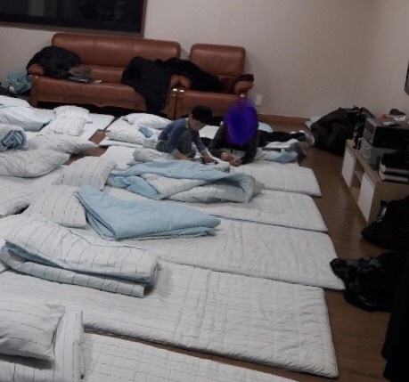 도착하고 보니, 연수 참가자들은 성별로 나누어 모두 한 방을 썼습니다. 마치 군대의 내무반처럼 말이지요. 커다란 다인실에서 매트를 깔고 다 함께 잠을 자고 옷도 갈아입는 듯 생활공간이 동일했습니다. '낯가림 심한 저 녀석이 어쩌나?' 큰 걱정을 했는데요, 이 아이 제 아이 맞나요? 아들은 제 집처럼 생활을 하기 시작했습니다. 아침식사 시간이 정해져 있어서 다 함께 일어나 밥 먹으러 가려고 준비하는 중에도 아들은 느긋하게 늦잠을 자기도 하고, 그곳에서 처음 사귄 낯선 이모님들과 화기애애한 시간을 보내기도 했습니다.