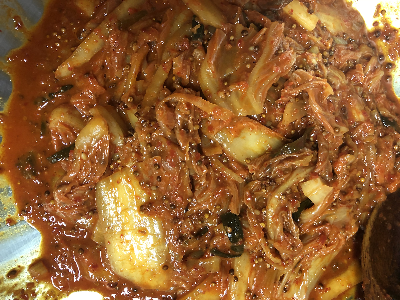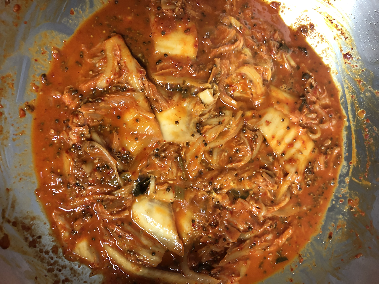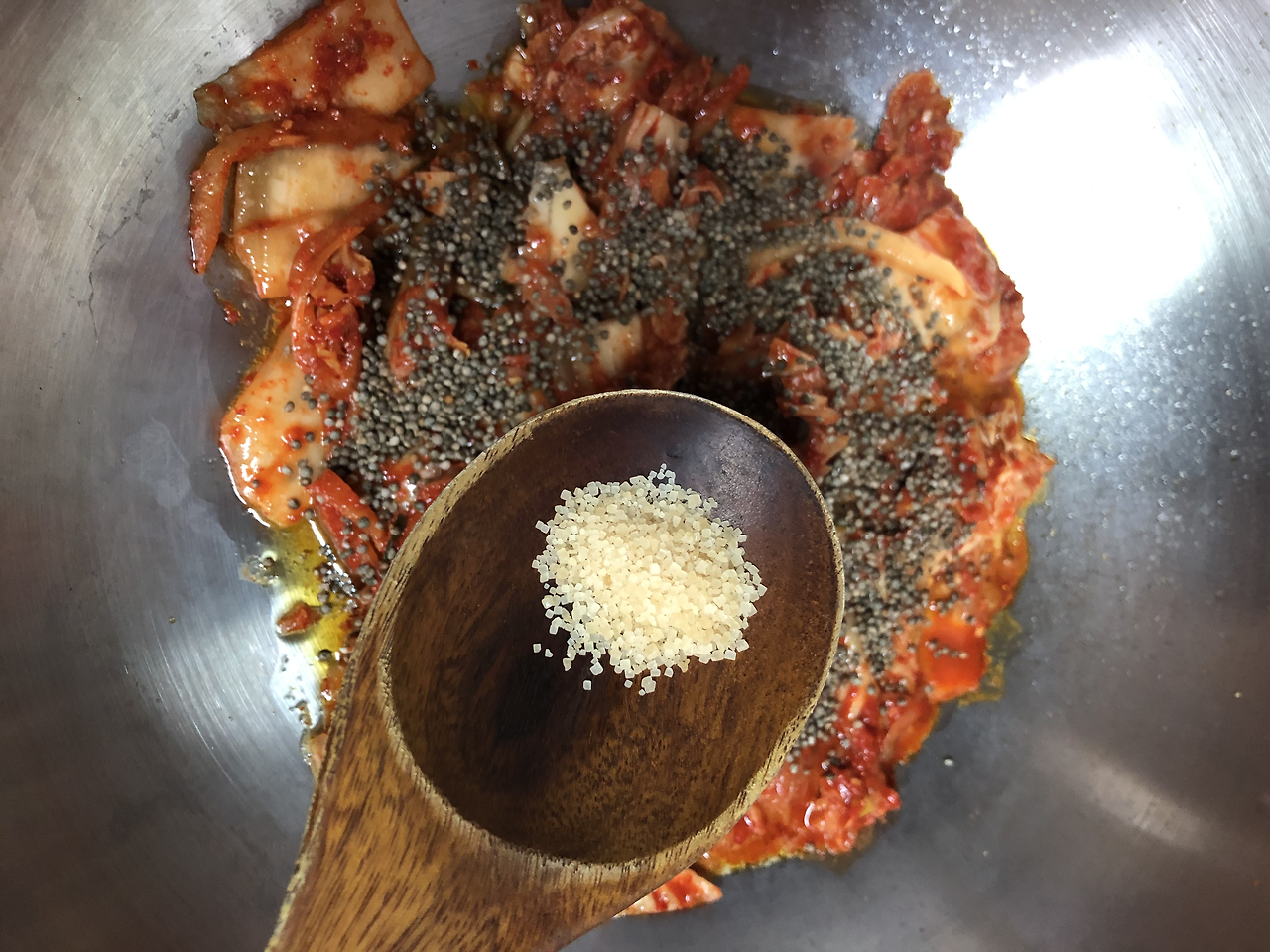 재료: 들기름(식용유), 김치, 설탕, 참깨(들깨)