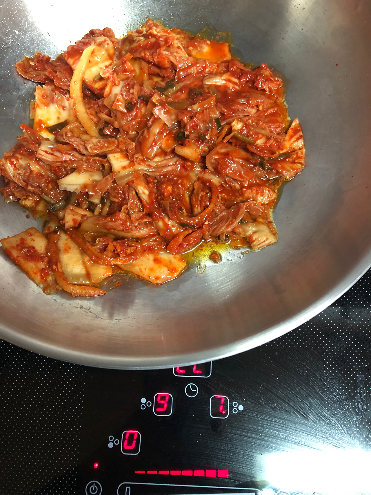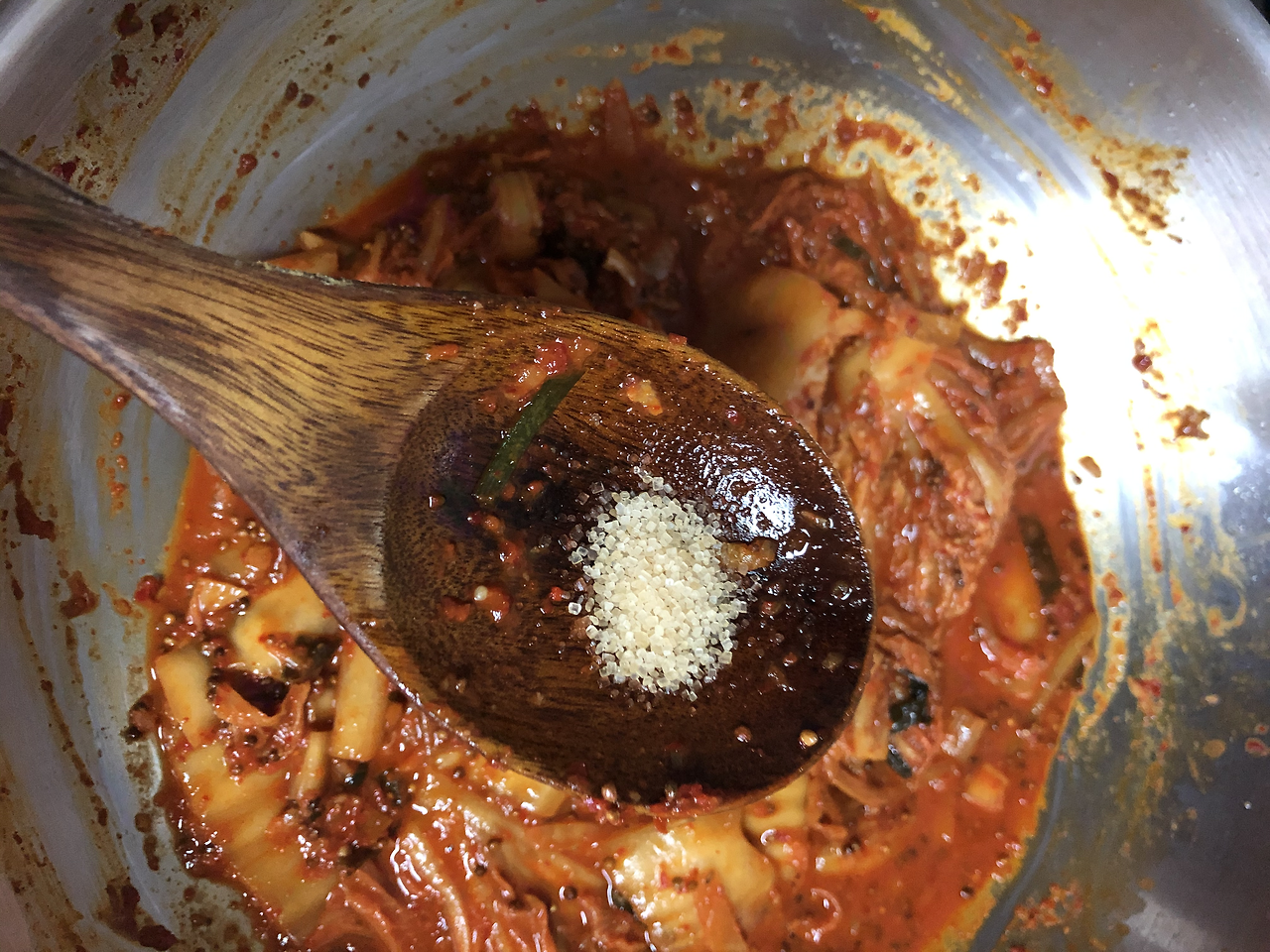 3. 김치에 기름이 골고루 둘러지도록 살짝 볶다가, 김치의 2/3가 잠길 정도로 자작하게 물을 붓습니다. 이 물이 우리들이 간을 맞출 시간을 벌어 줍니다. 간을 보니, 짠맛만 강하다면 설탕을 추가합니다.