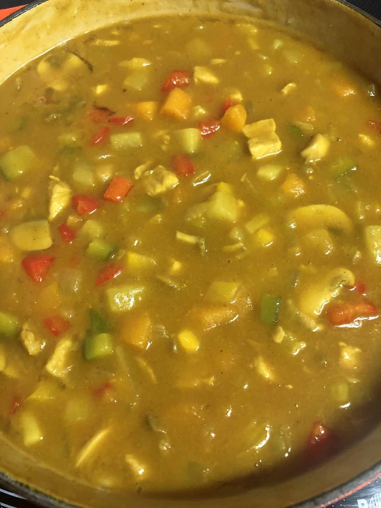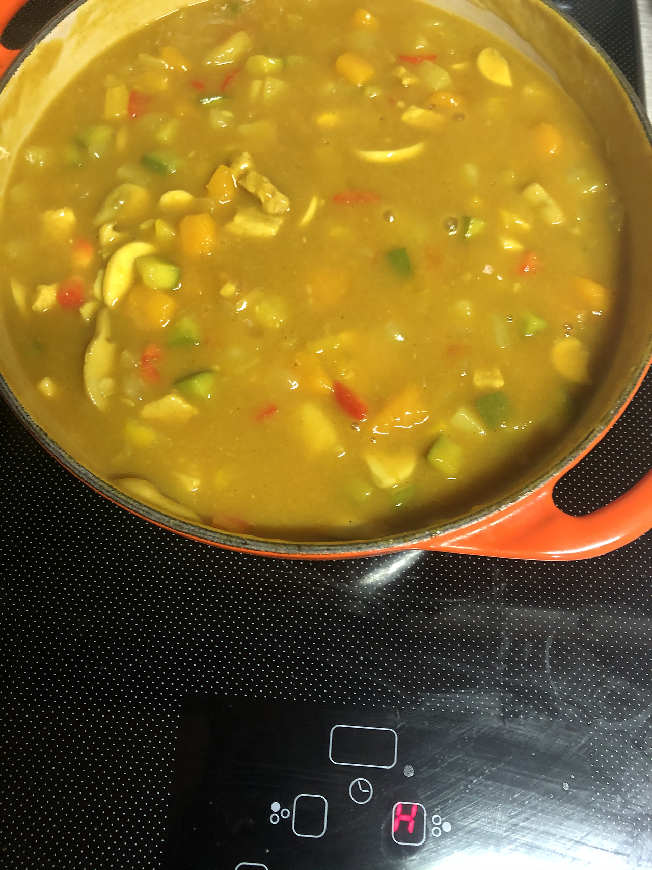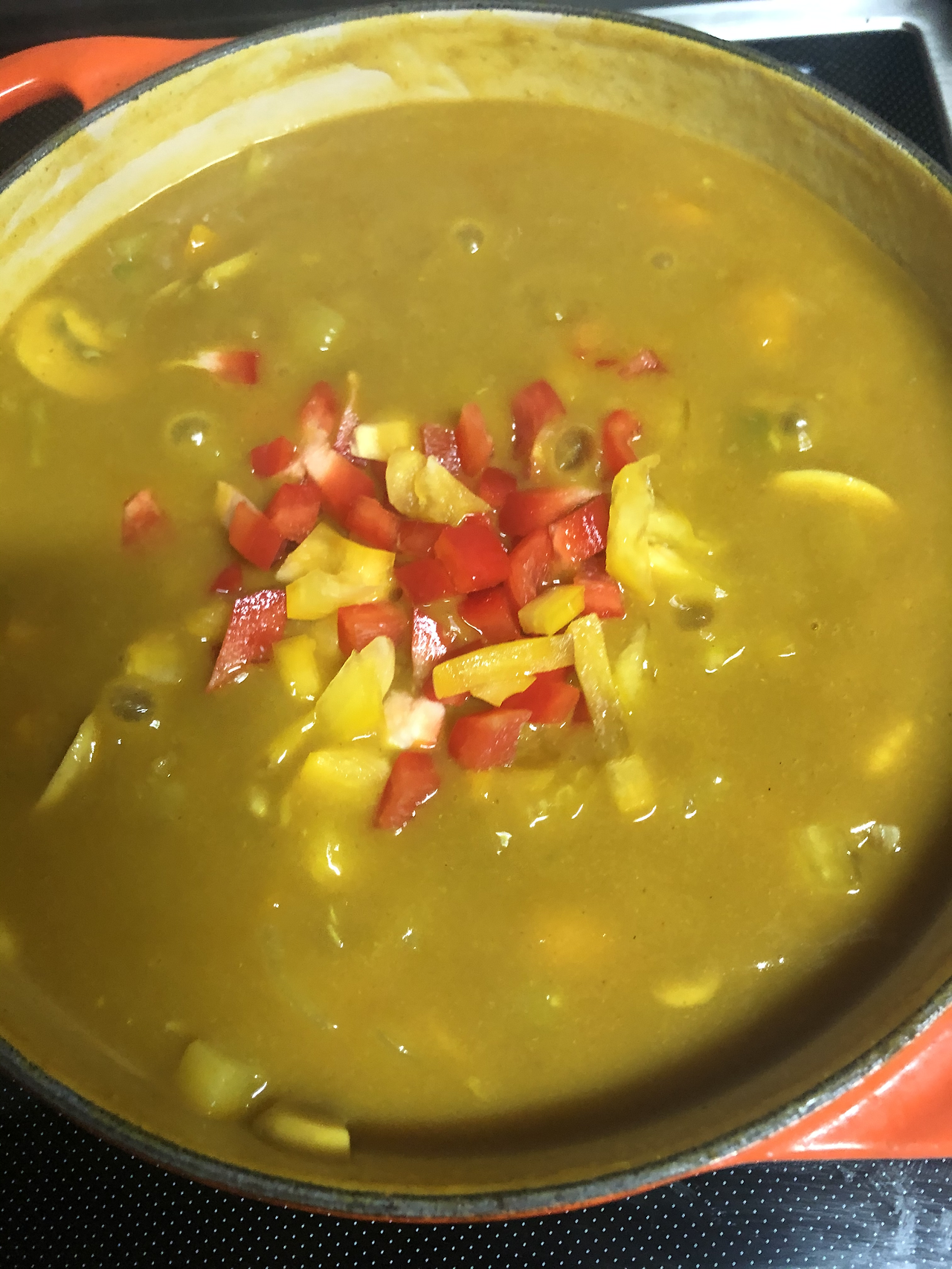 5. 원하는 점도까지 끓었다면, 파프리카를 넣고 골고루 섞은 후 불을 끄고 뚜껑을 덮고 카레의 잔열로 익힙니다.