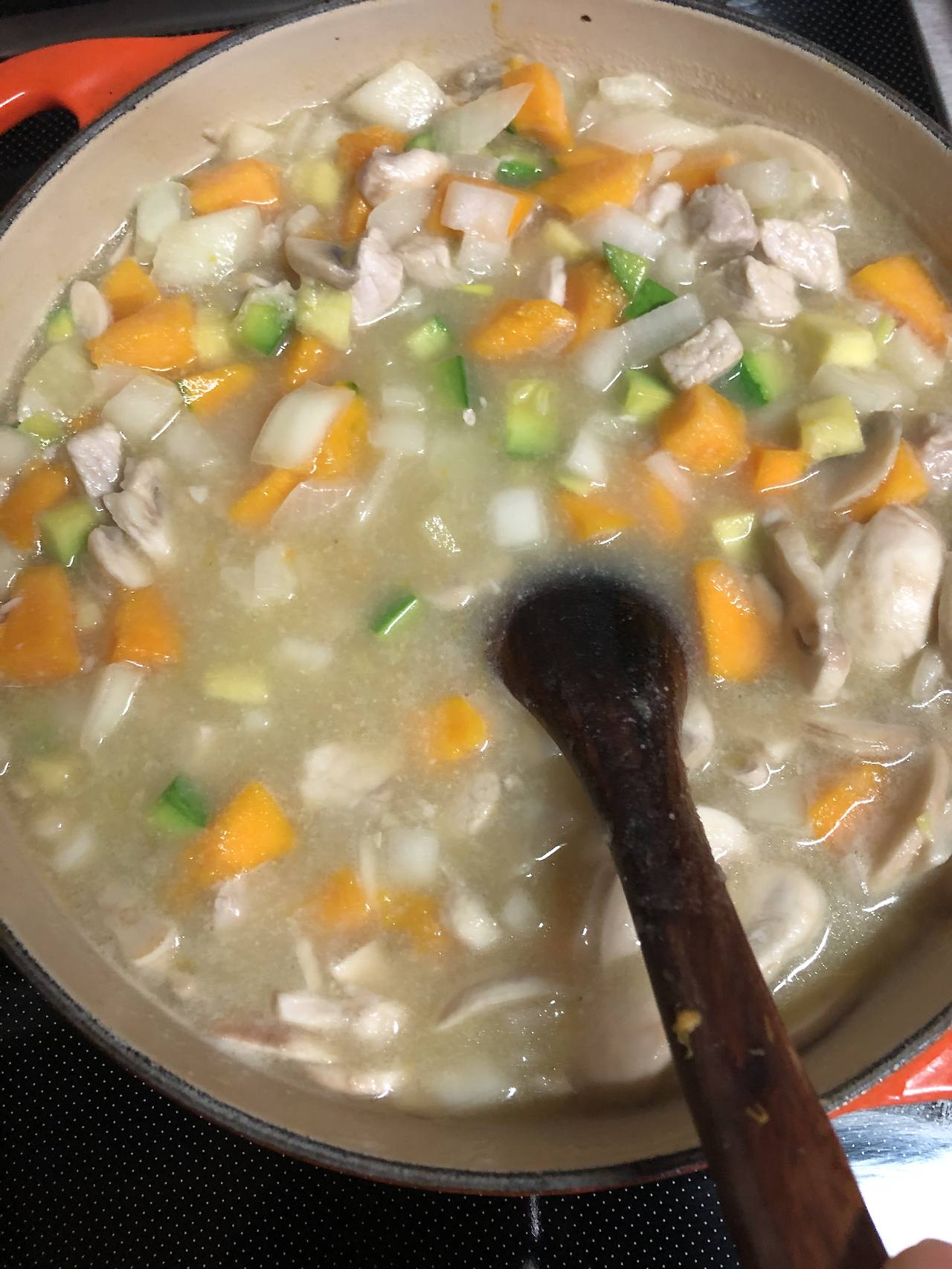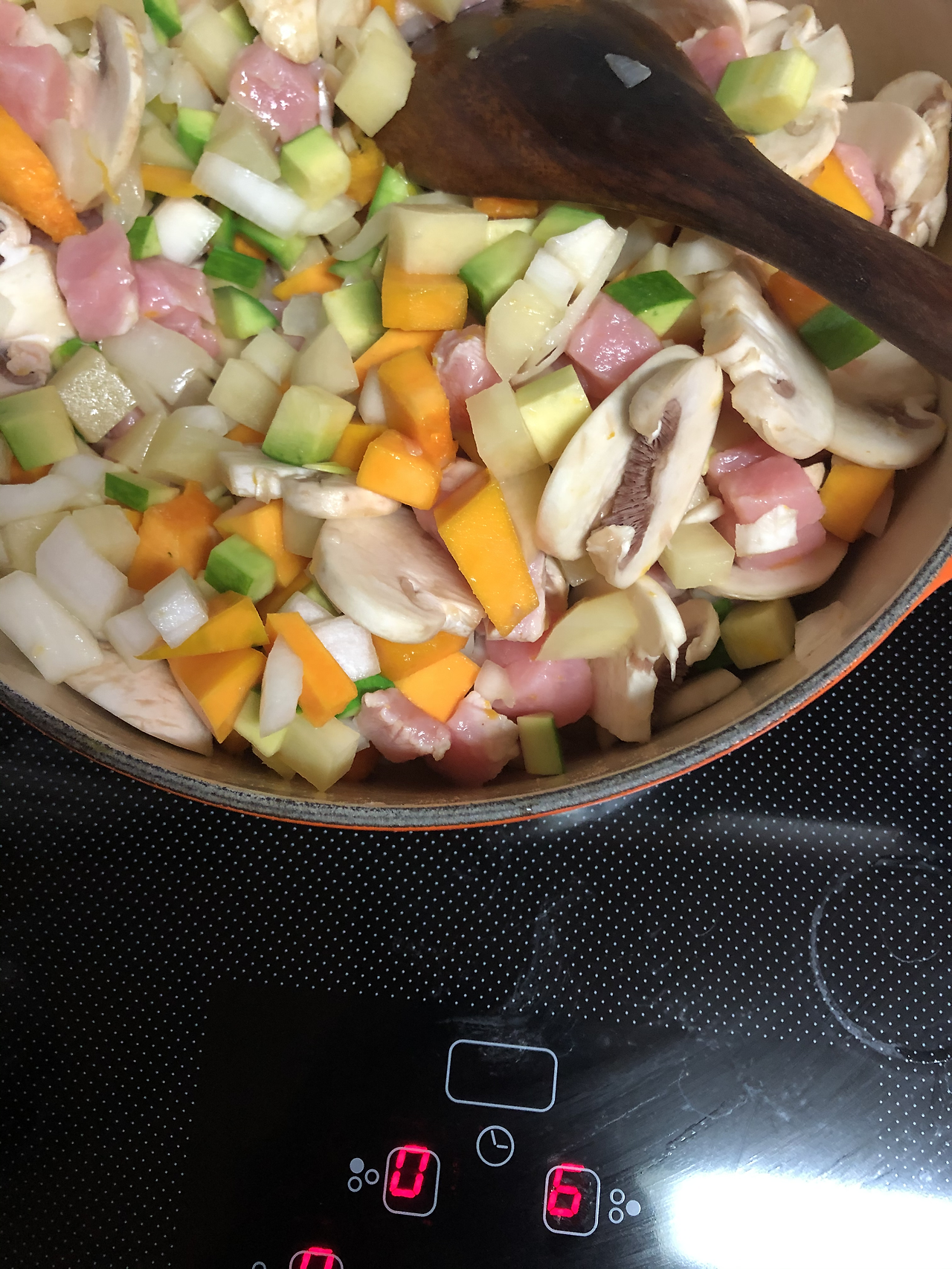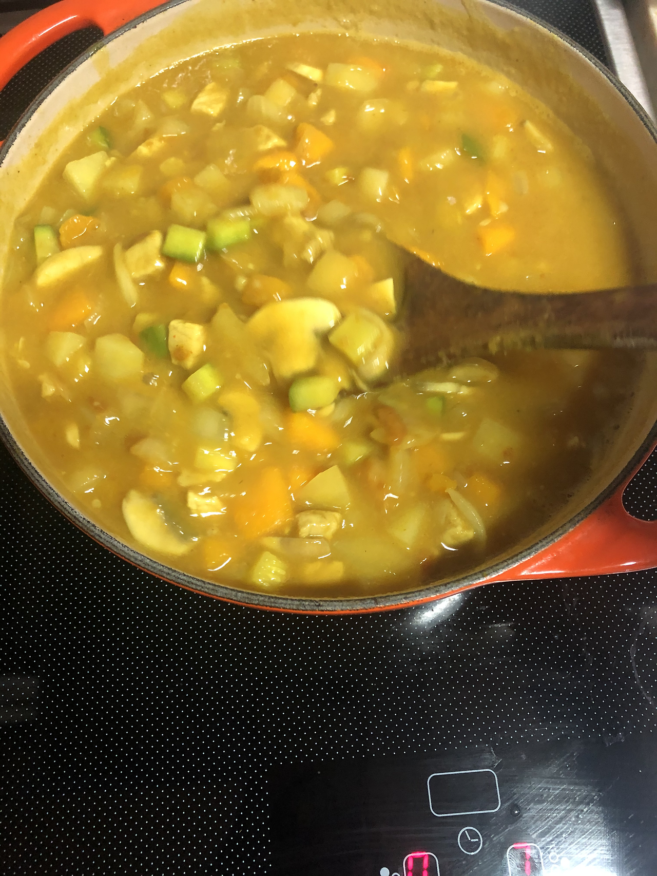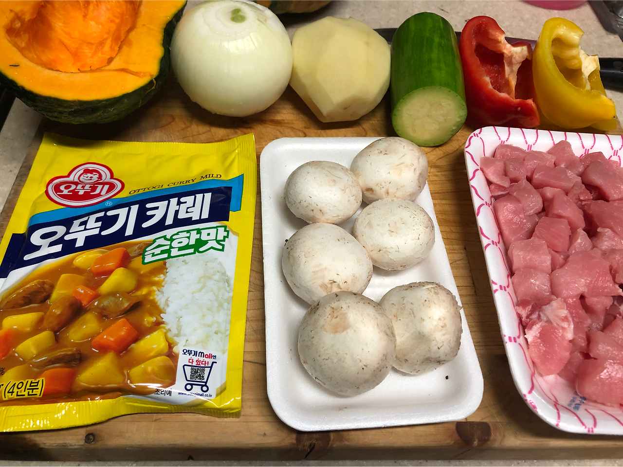 재료(카레 1 봉지 기준): 카레가루 1봉, 감자 중1, 양파 대 1, 단호박 1/2, 돼지고기 카레용 300g(닭가슴살), 양송이 조금, 애호박 1/2, 파프리카 1/2