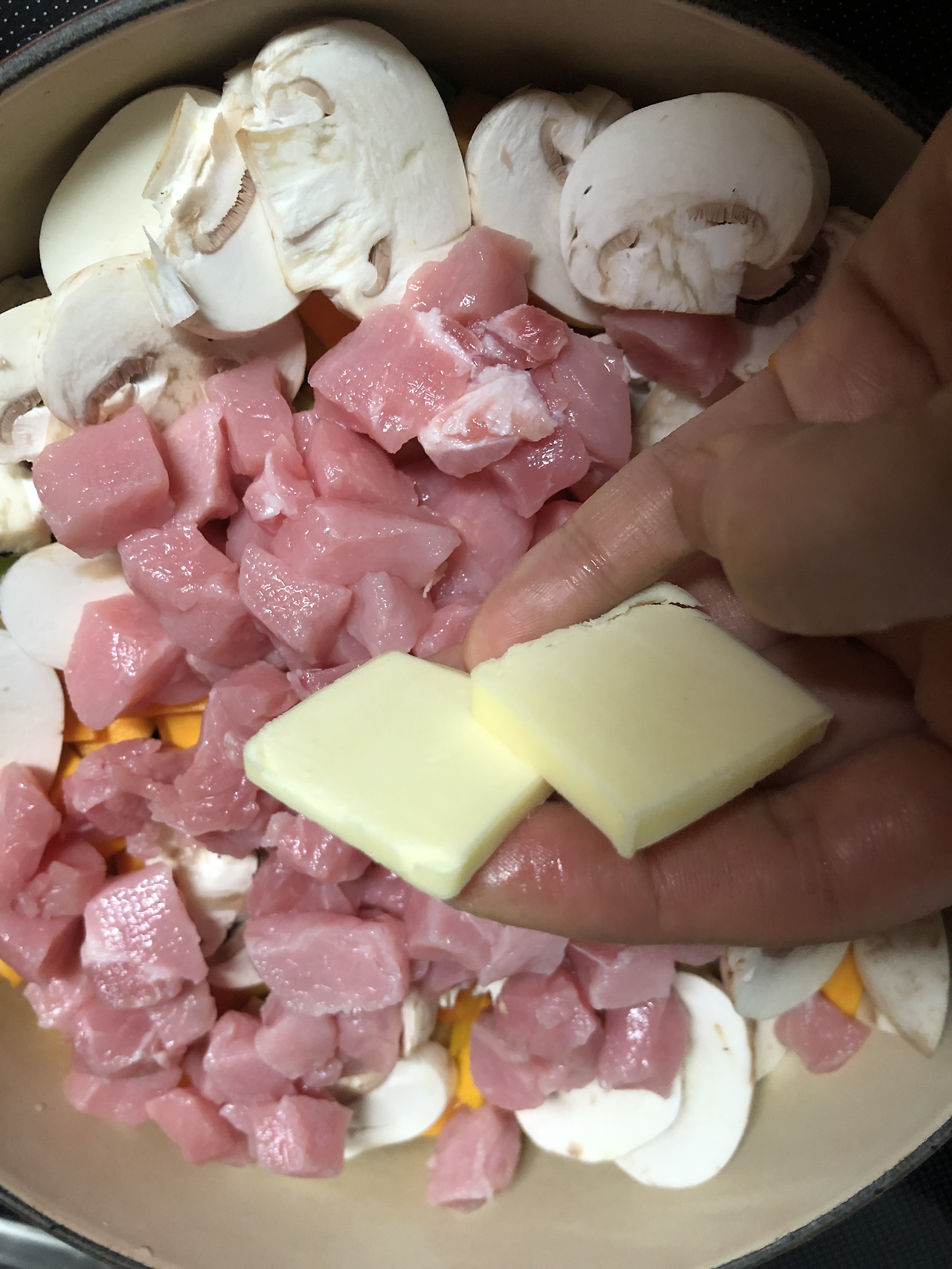 2. 파프리카를 제외한 재료를 냄비에 담습니다. 버터(식용유 가능) 약간을 바닥에 깔고, 중불에서 재료를 볶습니다. 고기의 핏기가 안 보일 때까지 볶기 위해, 재료가 바닥에 붙기 시작하면 물을 조금 붓고 계속 볶습니다.