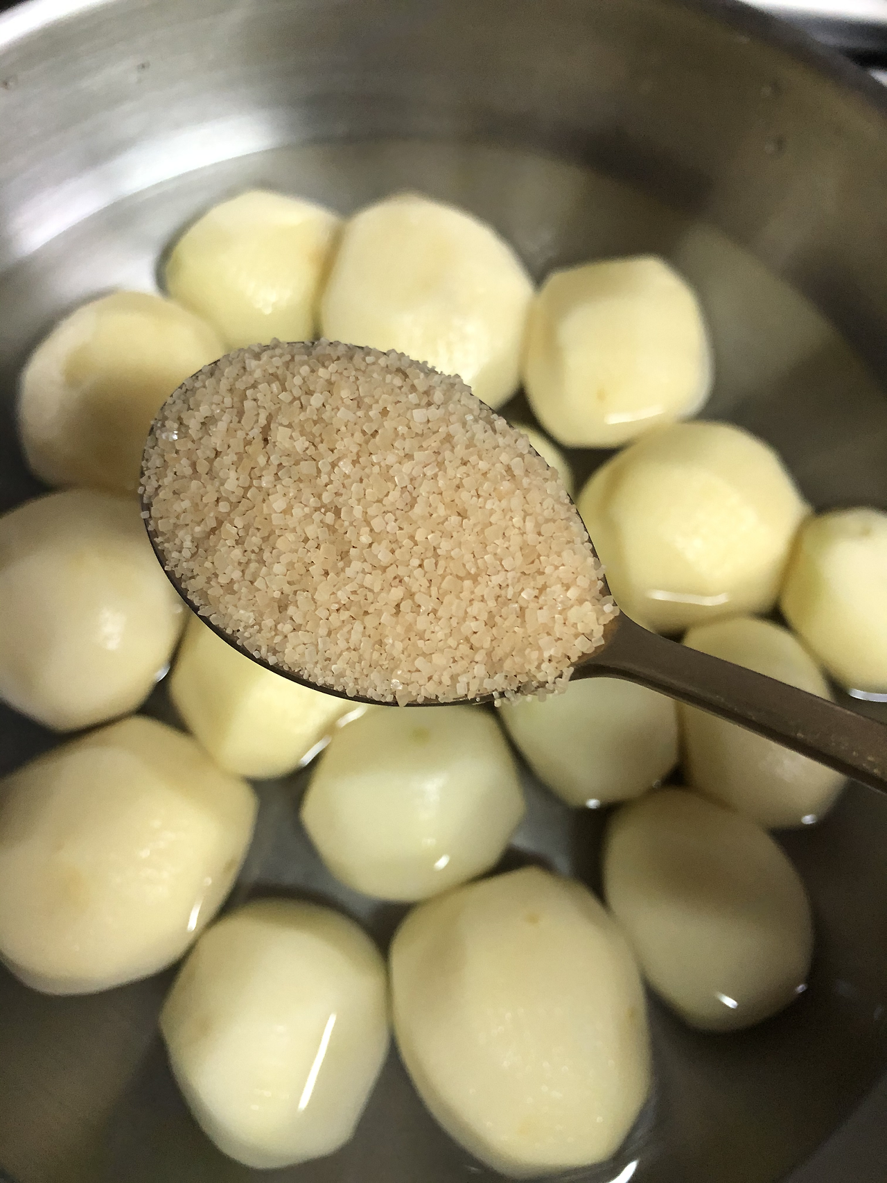 1. 껍질을 벗긴 감자를 냄비에 넣고 감자가 1/2~2/3 정도 잠기도록 물을 붓고, 설탕 산을 쌓아 1술, 소금 1/2술 넣습니다.