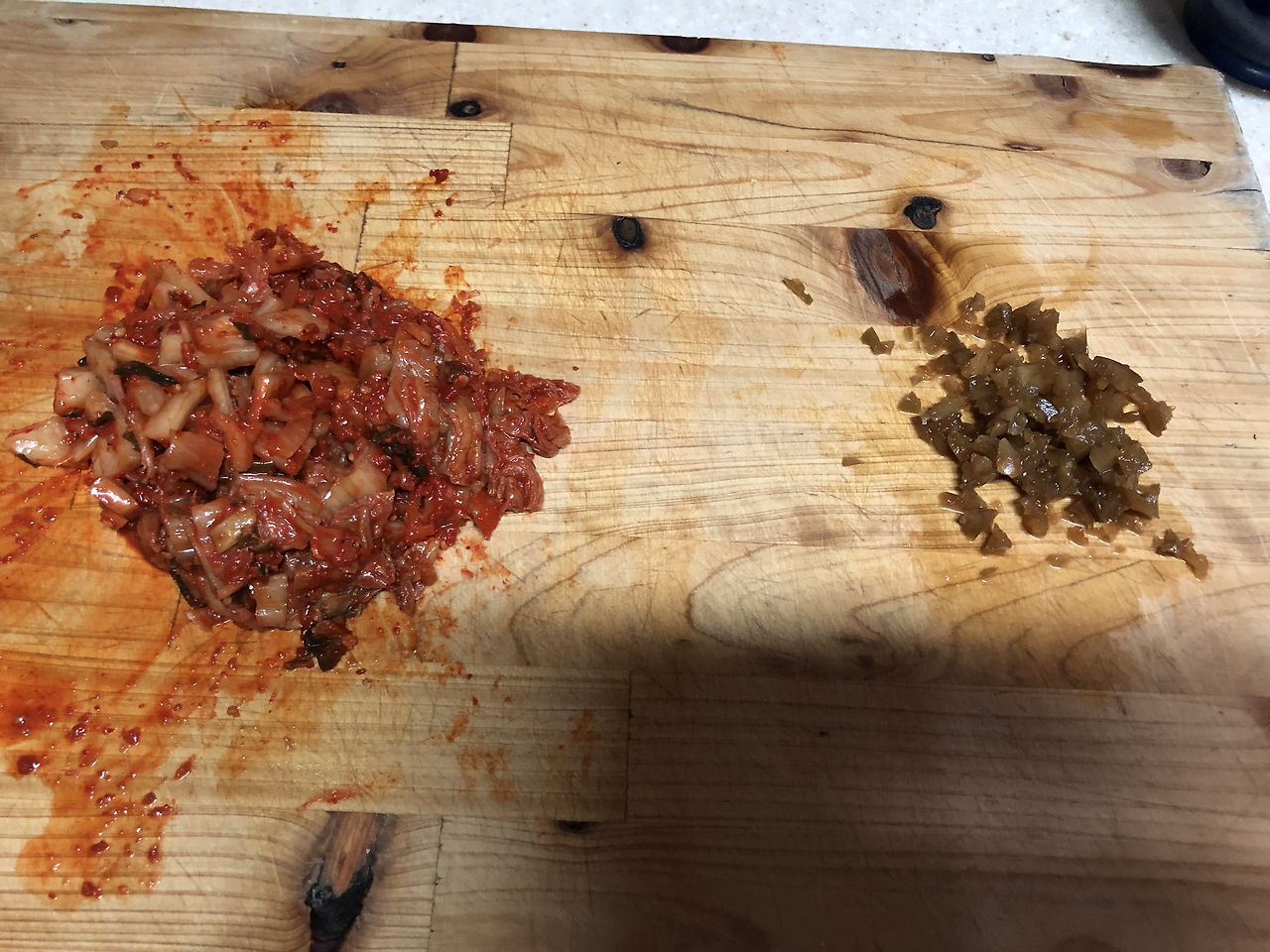 1. 삼겹살에 소금(+허브솔트)을 살짝 뿌려 굽습니다. 이때 김치와 매실장아찌를 잘게 자릅니다.