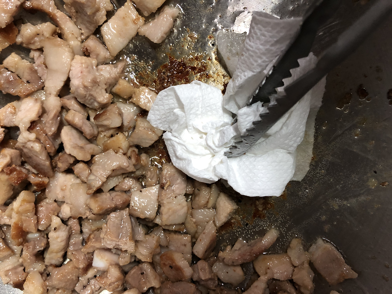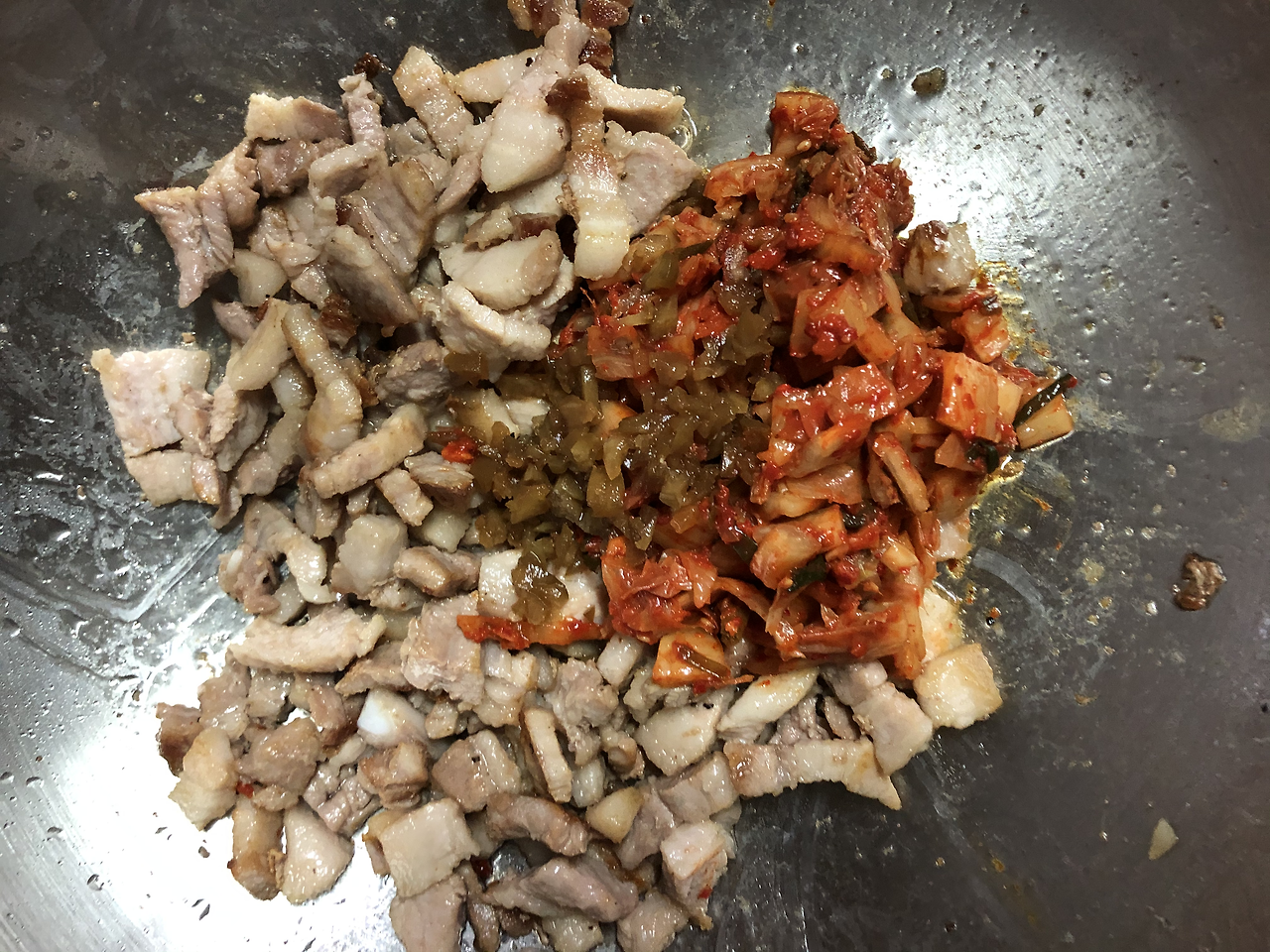 2. 고기가 적당히 익었을 때 가위로 고기를 잘게 자른 후, 기름을 조금 닦아내고, 잘라놓은 김치와 매실장아찌도 함께 볶습니다. 매실장아찌가 없는 분은 매실액 숟가락으로 대체합니다.