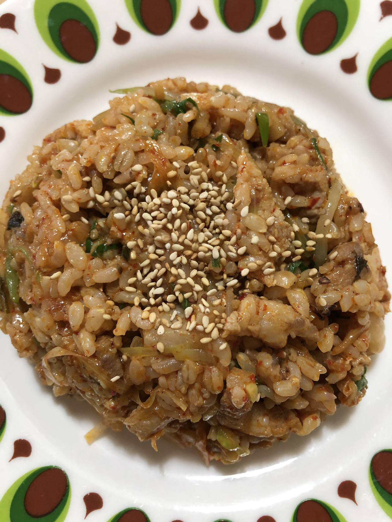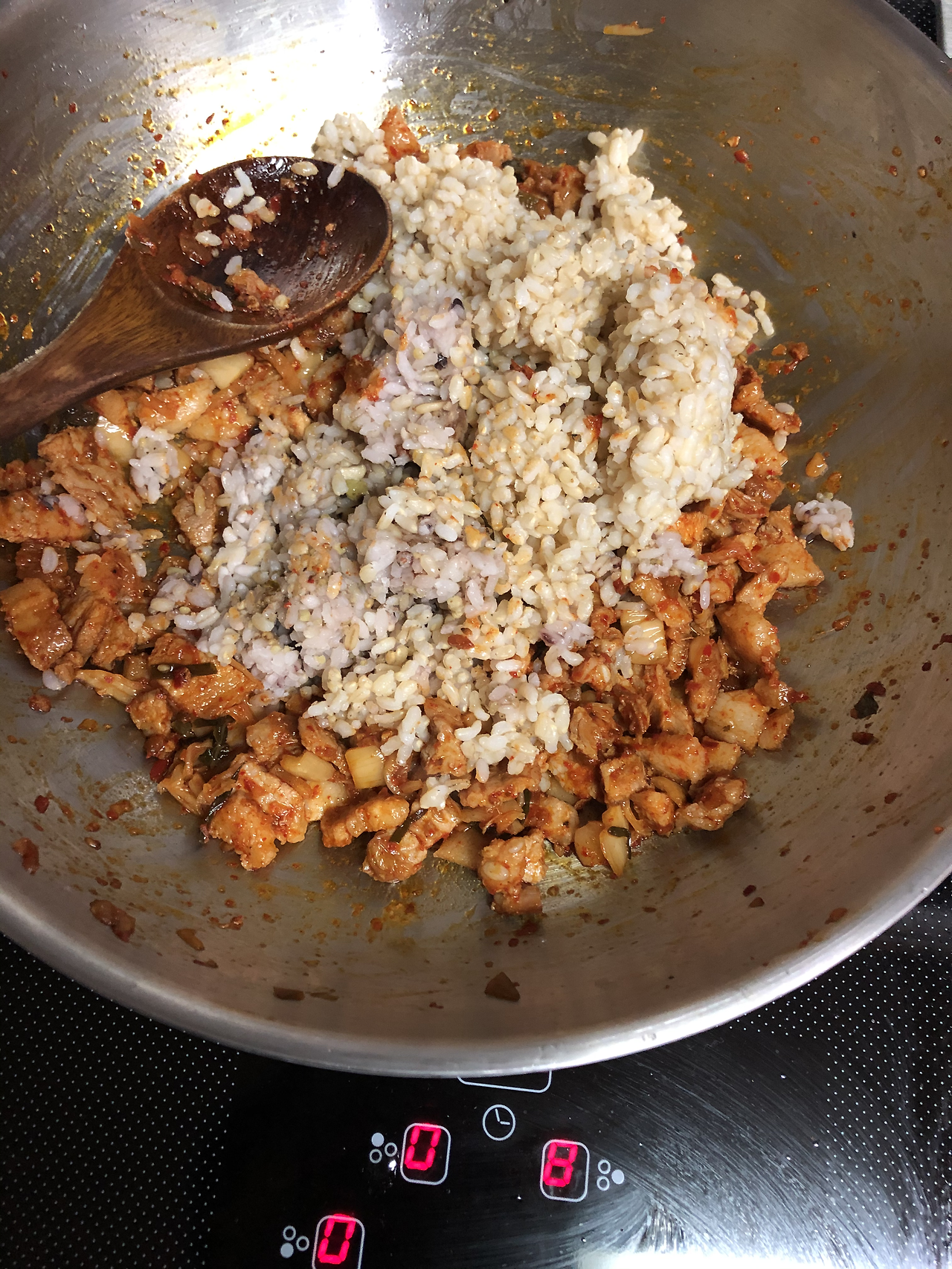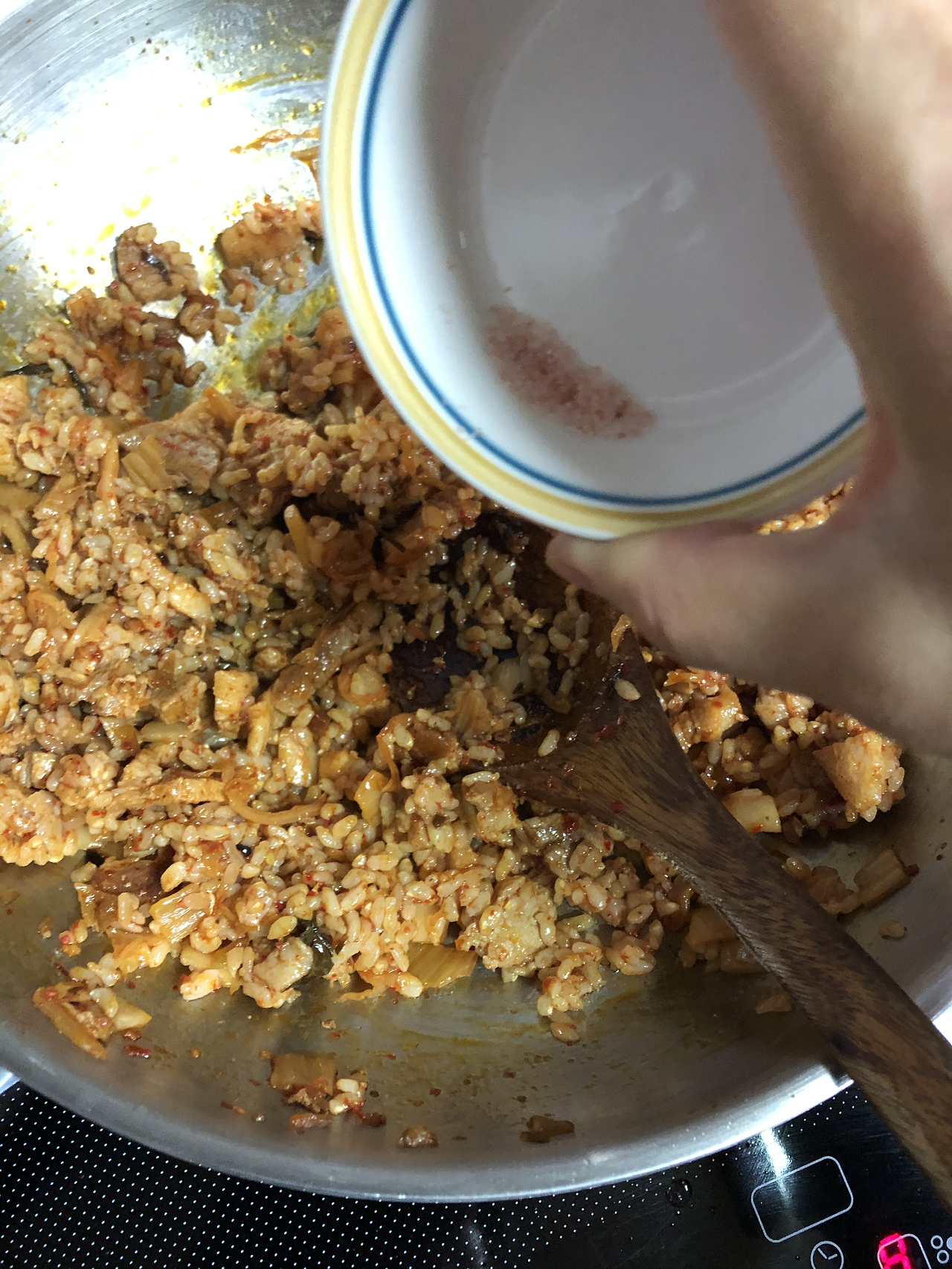 3. 김치가 주황빛으로 익기 시작하면 밥을 넣어 볶습니다. 밥알이 따뜻하게 익었을 무렵 맛을 보고, 부족한 간은 소금으로 맞춥니다.