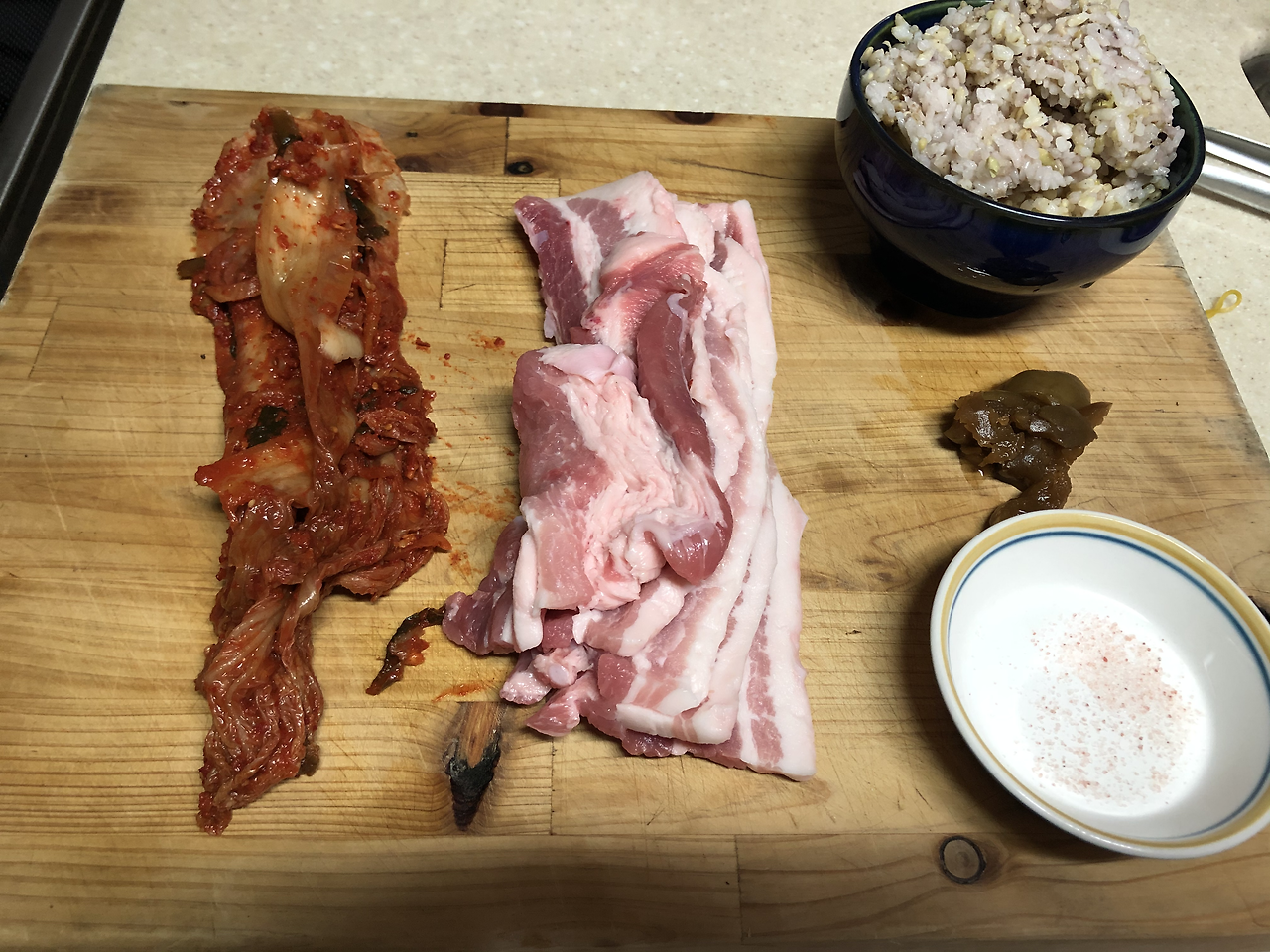 재료(1인분 같은 2인분): 삼겹살 300g, 김치 3 잎, 매실장아찌 조금(매실액 2술로 대체 가능), 밥 한 공기, 소금 약간