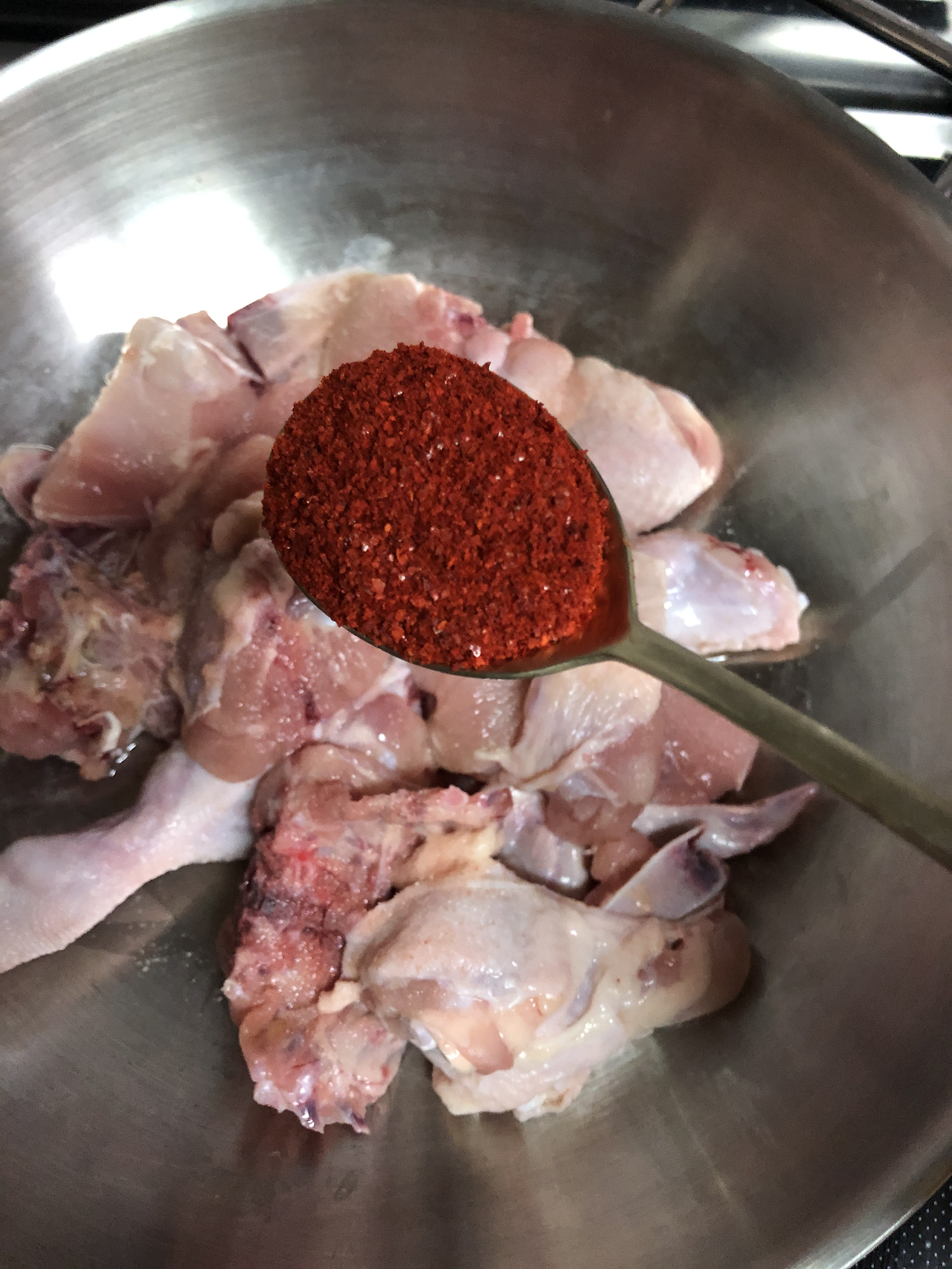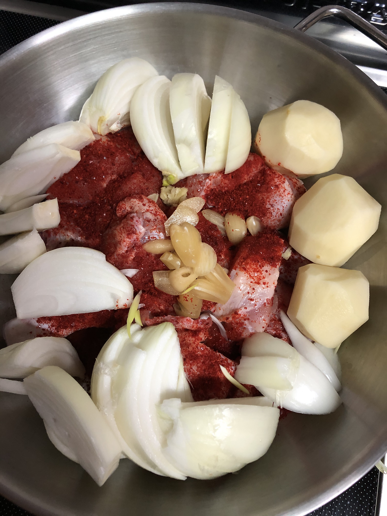 1. 깨끗이 씻은 닭에, 양파, 감자(큼직하게 넣어야 모양이 유지됩니다), 마늘, 생강, 맛술, 소금 1/2술, 고춧가루 2술을 넣고, 고춧가루가 재료에 골고루 입히도록 2분 정도 볶습니다.