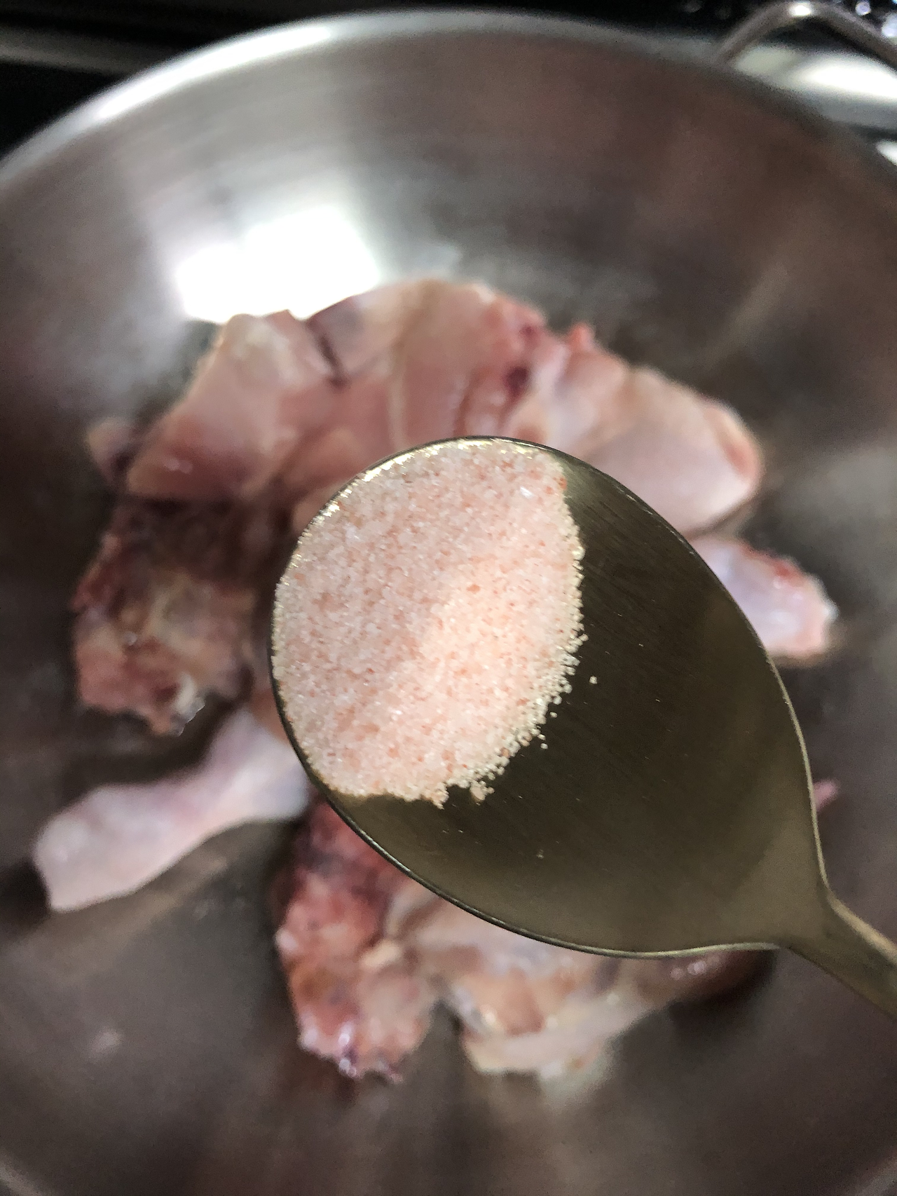 2. 그 정도면 닭껍질이 살짝 익기 시작할 때입니다. 이제 재료가 살짝 잠기도록 물 500~600ml 정도 붓고,