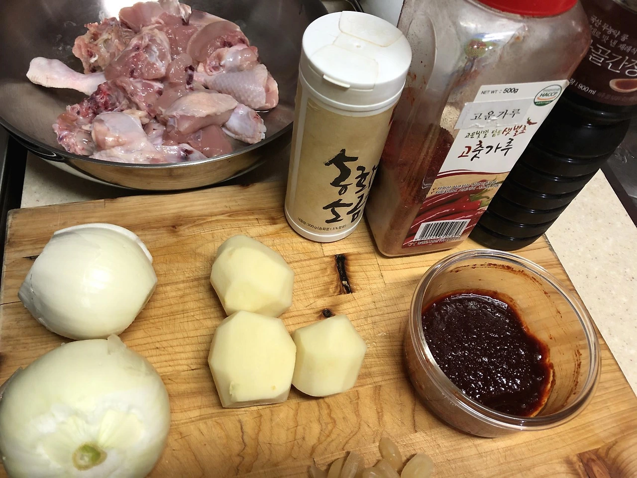 재료: 닭 1마리, 양파 2개, 감자 약간, 마늘, 국간장, 기준 양념장(양조간장+고춧가루+고추장+매실청), 고춧가루, 소금