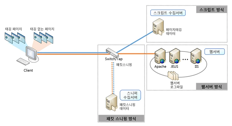 웹 서버와 WAS에서는 클라이언트의 요청 정보와 응답 정보(파라미터, 세션 정보 등), 그리고 해당 요청에 대한 응답 결과(응답 코드, 처리 시간 등)를 수집한다. 이러한 로그파일은 그 양이 방대하기 때문에 정해진 기준에 따라 로그분석 서버나 정보계로 보내고 삭제하는 경우가 많다. 이렇게 수집된 로그데이터는 DW 내 적재하여 현업이 분석하게 제공하는 경우도 있다. 하지만 보통 로그 분석도구를 이용해 분석된다. 가장 흔하게 쓰이는 것이 바로 구글 애널리틱스이며, 그 외에도 여러 솔루션사가 로그 분석 솔루션을 만들어 제공하고 있다.