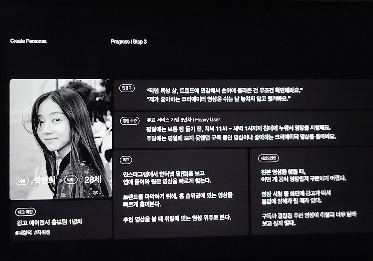 아래는 플러스엑스팀이 실제 사례로 보여준 페르소나이다. 동영상 스트리밍 앱의 사용자가 잘 상상되는가? 이렇게 눈에 보일 듯, 손에 잡힐 듯 구체적인 것이 페르소나 방법의 매력적인 지점이라 생각한다. 사용자를 아무리 생각한다 해도 기획자/공급자의 관점을 버리기 어려운데, 정말로 남의 신발을 신어보는 경험을 하게 해 주기 때문이다.
