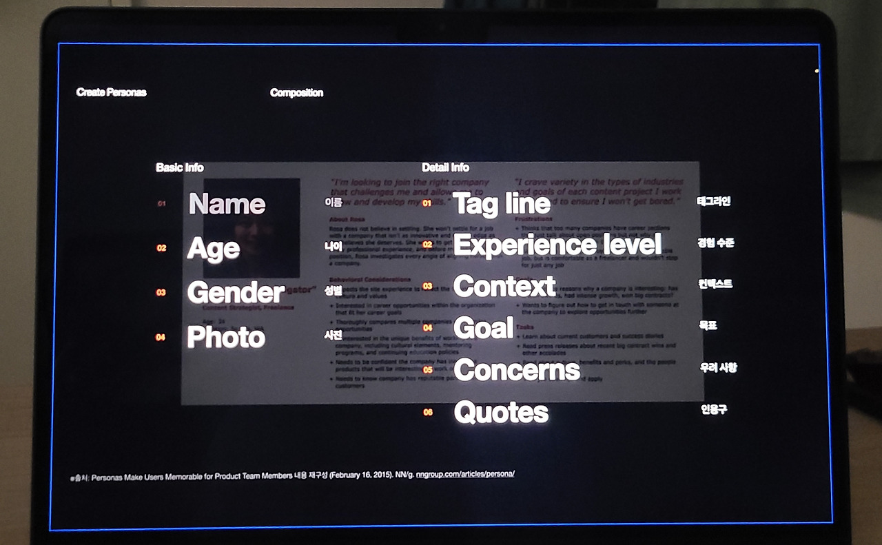 - 이런 기본정보들을 페르소나에 대한 기본적인 인구통계학적 정보를 제공하며, 동시에 프로젝트팀이 사용자에 대해 상상하는 것을 돕는다. 특히 사진은 여러 개의 태그를 적는 것보다 많은 정보를 팀 내에 공유할 수 있게 돕는다.