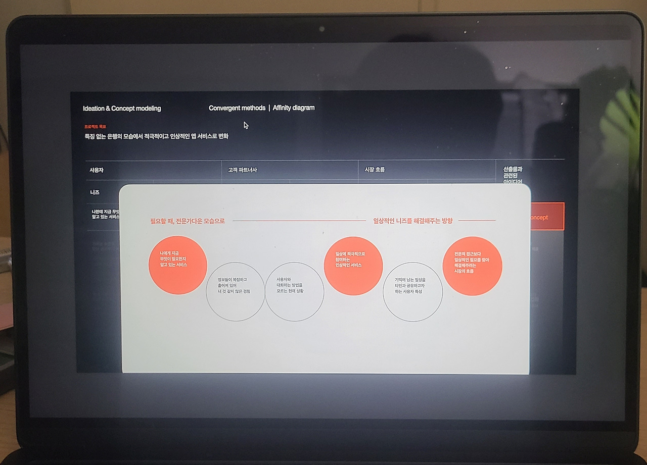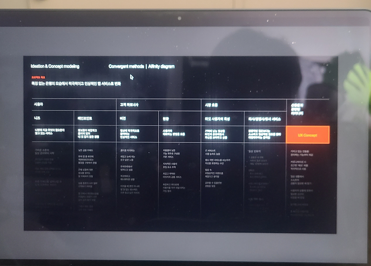 아이디어를 내고, 그루핑 하고 그래서 라벨링 하는 과정이 바로 어피니티 다이어그램이다. 플러스 엑스 사례를 살펴보자. 사용자 인터뷰, 고객사 인터뷰, 사용자에 및 경쟁 서비스에 대한 리서치 자료들을 바탕으로 카테고리화한다. 그리고 지금까지 모은 데이터들을 바탕으로 각 카테고리에 배정한다. 그리고 이렇게 모인 카테고리들에 대해서 각 그룹이나, 그룹을 연결해 아이디어를 도출한다. 여기서 플러스엑스만의 관점이 흥미로웠는데, 어피니티 다이어그램도 최대한 산출물과 관련된 아이디어로 연결하는 도구로 활용하고 있다. 탬플릿 자체에 산출물과 관련된 아디디어들을 정리하게 해 둔 것이 인상적이었다.