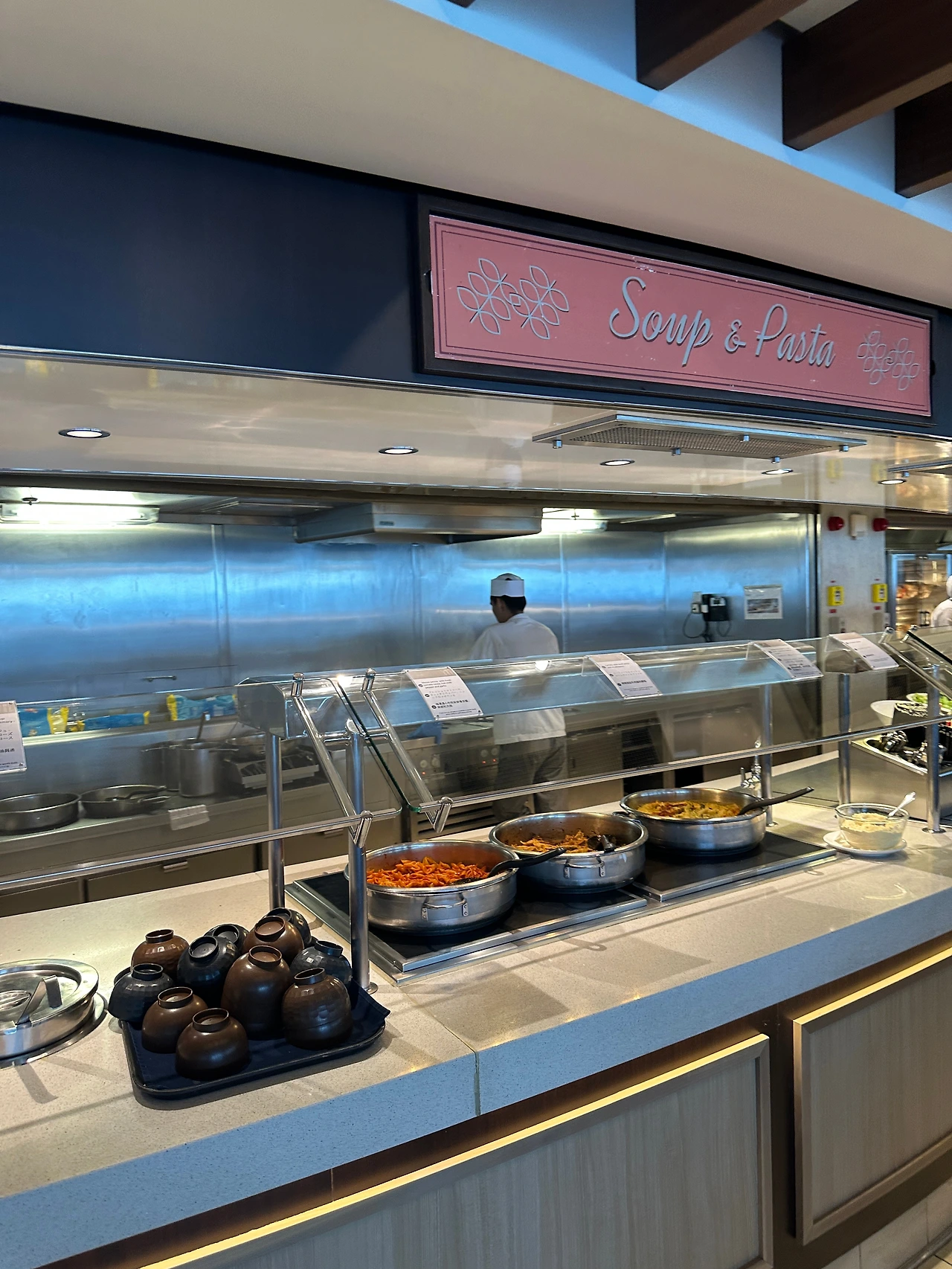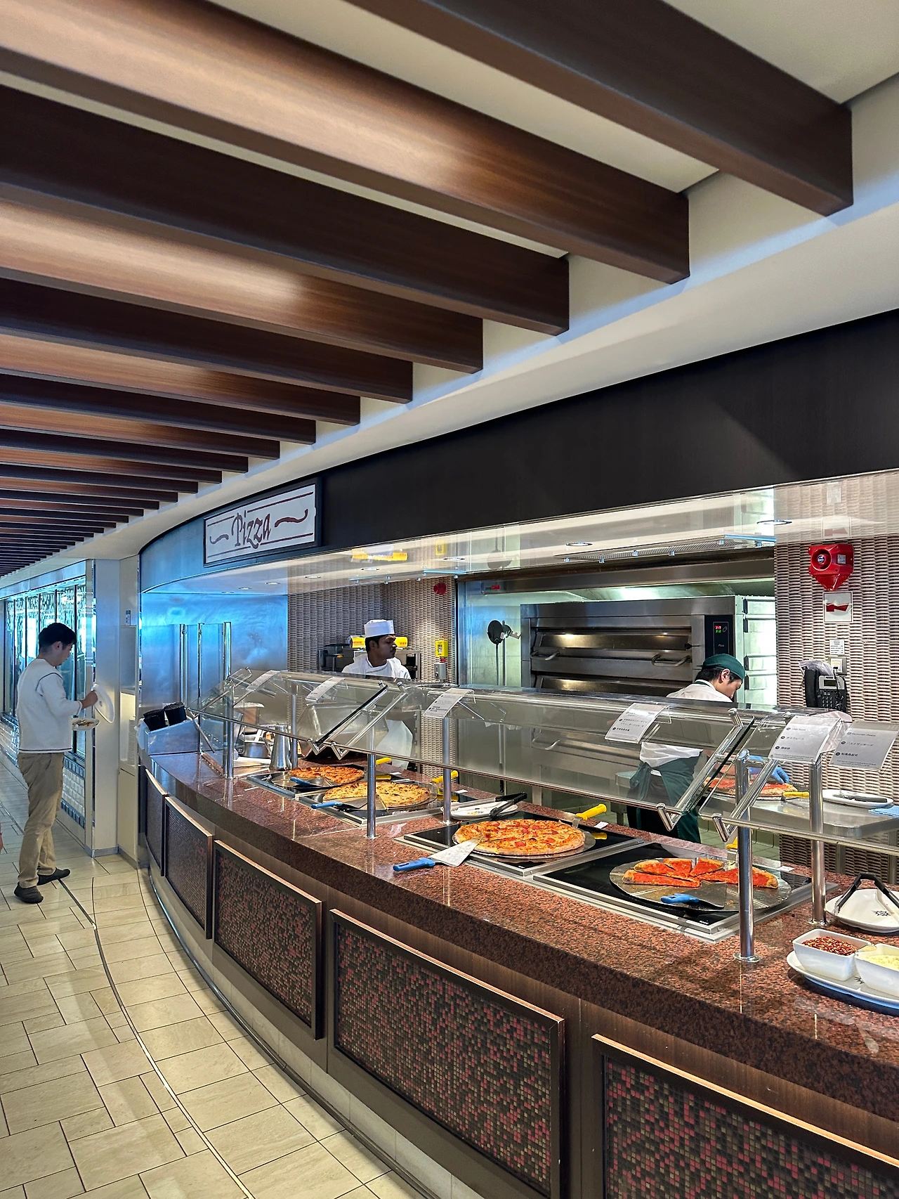 벨리시마 크루즈 뷔페는 일본과 대만, 상해 등을 오가는 크루즈라 일식과 중식 코너도 있는 게 특징이다. 하지만 이탈리아 선사인만큼 피자가 정말 맛있다. 피자는 아침부터 저녁까지 쉴 새 없이 계속 구워져 나오지만 항상 인기 있는 코너였다. 맛도 서울에 웬만한 프랜차이즈 피자집보다 맛있어서 우리도 끼니마다 잘 먹었다. 피자 하나만 해도 크루즈의 식사에 대한 만족도는 충분했다. 음식 종류나 질도 내로라하는 호텔 뷔페만큼은 아니라도 준수한 수준을 갖추고 있었다.