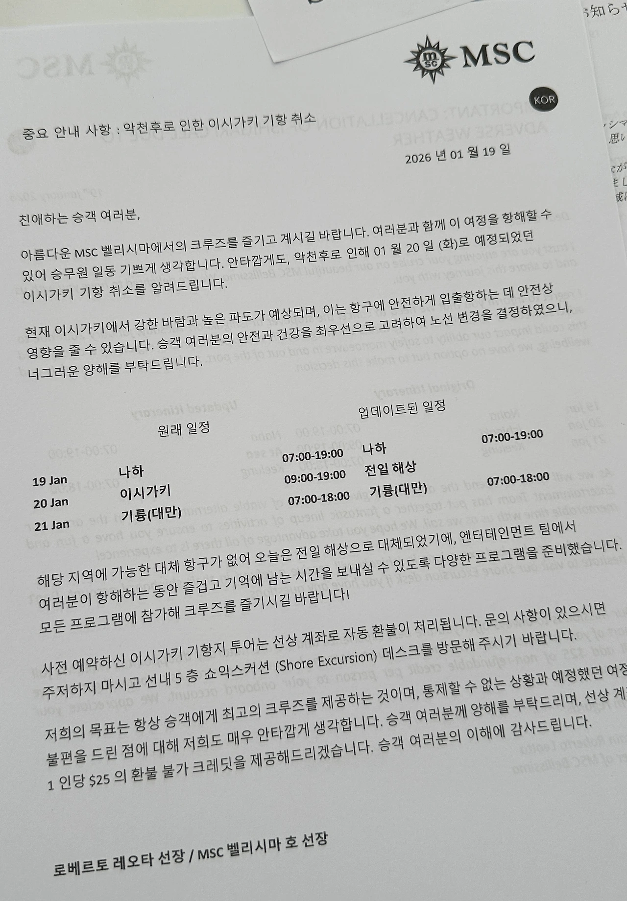 이시가키섬 기항이 취소됐다. 그것도 악천후로 인해…. 크루즈는 작은 섬에 기항할 때는 기후에 따라 자주 취소된다는 점을 알고 있기에 크게 동요하진 않았다. 기항지가 취소된 것에 대한 아쉬움보다는 1인당 25$의 크레딧을 제공해 주는 것에 기뻐하며 라운지에서 음료나 젤라또를 사 먹자 하며 좋아했다.