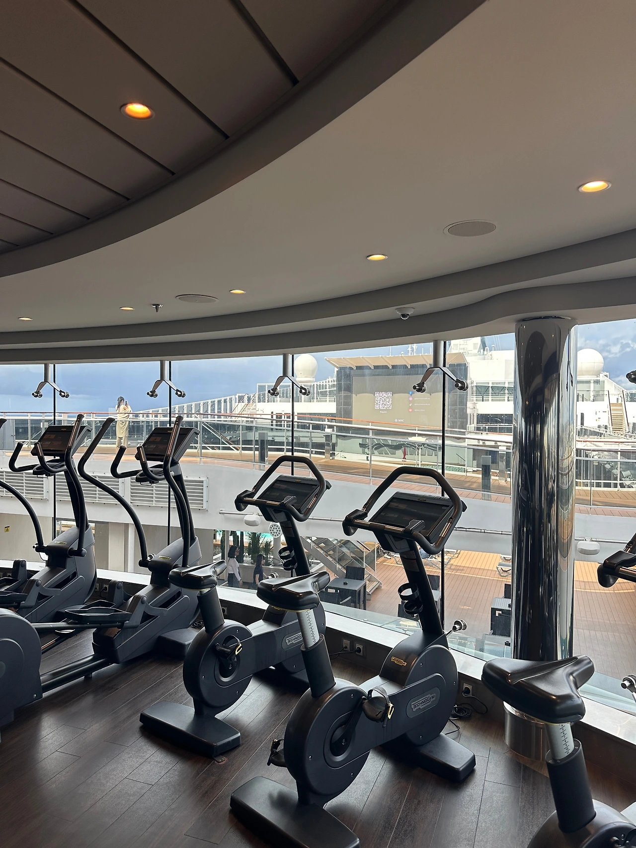크루즈 위쪽으로 올라가 보니 가운데는 역시 야외수영장과 자쿠지가 있고, 조깅트랙도 갖춰져 있었다. 실내로 들어가 보니 전망 좋은 헬스장과 라운지가 있고, 다목적 체육관처럼 농구코트가 그려진 곳에선 선셋요가나 스트레칭등 다양한 프로그램이 진행될 예정이었다. 작은 오락실과 키즈클럽도 보이며, 배의 뒤쪽으로 가보니 워터슬라이드까지 있는 수영장이 나왔다.