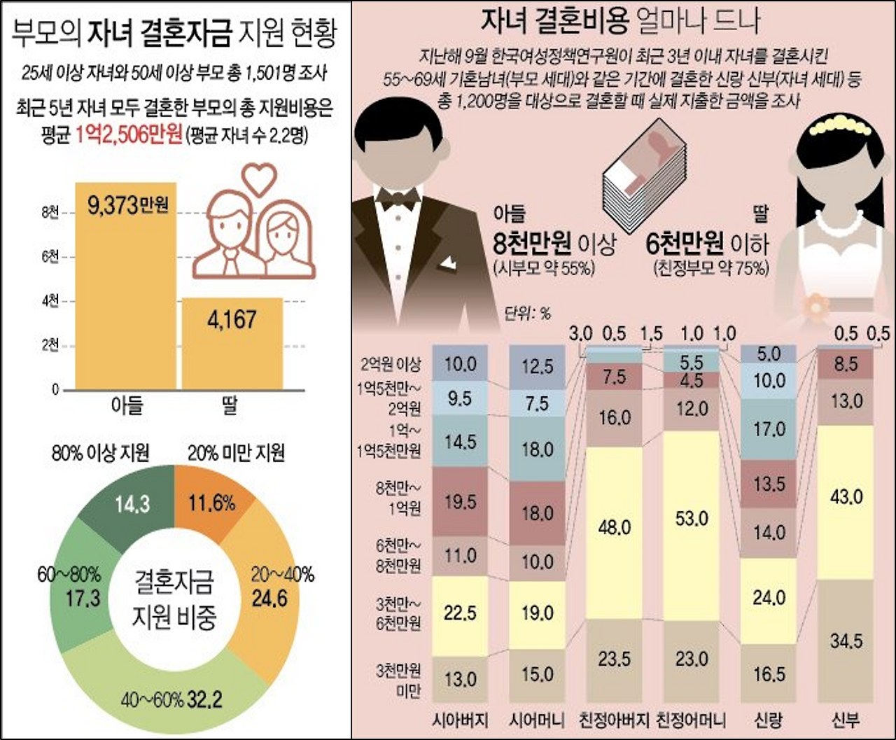 충분히 많이 부담하고 계십니다. 총 결혼비용의 40% 이상을 도와주시는 부모님들의 비중이 약 64% 정도입니다. 부모님들은 은퇴 후에, 나중에 본인들이 사용하셔야 될 자금까지도 자녀분들께 주고 계십니다. 집안이 여유롭다면 상관없습니다. 그러나 그 정도가 아니라면 미리 준비하셔야 합니다. 왜냐하면 비혼을 원하는 분들을 제외하고 나머지 분들은 결혼을 원하고 하시니까요.