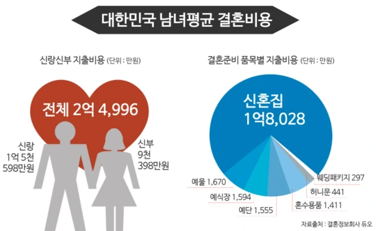 현실적으로는 이렇습니다. 물론 결혼정보회사에서 조사한 내용이므로 경제적으로 여유가 있는 사람들끼리 만날 가능성이 높기에 대다수의 사람들보다는 지출비용이 높을 수 있다는 점은 고려하셔야 하겠지만, 그래도 적은 금액으로는 충분하게 준비할 수 없다는 점 또한 고민이 필요한 문제입니다.