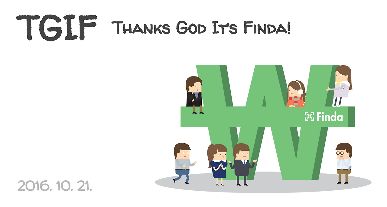 비전 및 방향성을 다시 상기시키고 또 변경되고 발전되는 부분에 대한 싱크를 하기 위해 여러 가지 노력을 하지만 그중 가장 중요하게 생각하는 것은 TGIF입니다 (유명한 구글의 TGIF를 차용한 것입니다. 초기 구글의 TGIF영상이 궁금한 분은 여기를 클릭하세요.) TGIF (Thanks God It’s Friday (or Finda))는 매주 금요일에 멤버 전체가 참여하는 세션으로 진행되고 있는 프로젝트들의 전체적인 방향성 및 기대효과에 대해 공유를 하고 또 멤버들이 갖고 있는 회사의 전략과 관련된 질문에 대한 솔직한 답변과 논의를 하는 시간입니다.