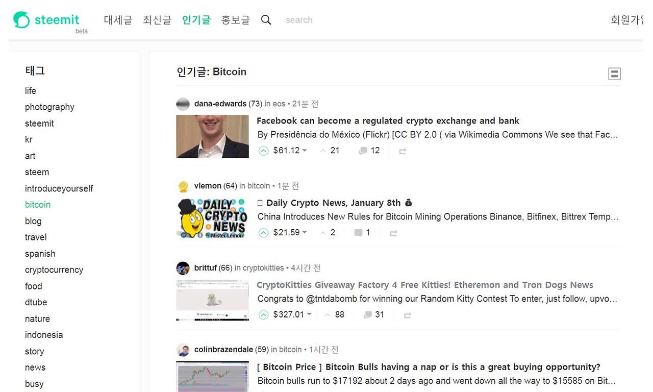 ‘스팀잇’은 블록체인 기술을 적용한 블로그다. 스팀잇에 게시물을 작성하고, ‘투표(vote)’를 많이 받으면, 받는 만큼 ‘스팀달러’, ‘스팀’ 등 스팀(steem) 계열 코인으로 보상받는다. 게시물 인기는 투표 수로 인정받으며, 인기 많은 게시물일수록 보상을 많이 받는다. 즉, 보상이 높은 게시물일수록 신뢰도가 높은 편이다. 게시물이나 질문 수준도 타 커뮤니티 보다 높고, 일반적으로 특정 코인에 관한 정보와 블록체인 기술에 관한 정보가 많다. 작성자와 투표자 모두 보상을 받을 수 있다. 참고로 모든 글에 투표하는 것을 방지하기 위해 글이 작성되고 15분안에 투표하면 보상을 받지 못하고, 작성 후 15~30분 사이에 투표하면 보상의 50% 밖에 받지 못하는 규칙 등이 있다.