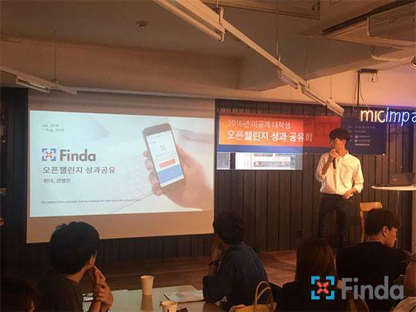 무엇을 하든지 자세하진 않더라도 대략적인 방향성이 잡힌 이유가 필요했다. 그래서일까. 그 때문에 내 인생의 방향성을 찾기 위해서 어른들이 흔히 말씀하시는 쓸데없는 짓(?)을 꽤 많이 했던 것 같다. 핀다에 합류하게 된 것도 그 때문이었다. (그렇다고 핀다의 조인한 게 쓸데없는 짓이라는 뜻은 아니다) 학교에서 가르치는 과목들을 왜 배우는 지도, 실무에서 어떤 식으로 쓰이는지도 모르고 수업을 듣자니 좀이 쑤셨다. 그래서 선택한 게 ‘인턴’이었다. 컴퓨터 공학을 전공하고 있는 나는, 미래창조과학부에서 주최한 이공계 인턴쉽 프로그램 ‘오픈 챌린지'에 참여한 덕분에 ‘핀다’를 만날 수 있었고, 얼떨결에 우수 인턴으로 선정되었다. 25개의 인턴쉽 참여 기업들과 참여 인턴들 앞에서 대표로 성과공유를 발표해보는 좋은 경험도 해볼 수 있었다. 인턴쉽이 끝나고 정식 인턴으로 채용되어 현재 나는 핀다의 Database를 맡고 있다.