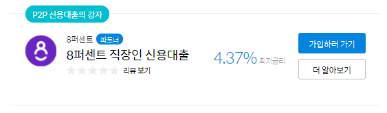 대환대출을 목적으로 하고있는 사용자들에게 많이 추천되는 P2P대출, 그중에서도 가장 많은 클릭을 받은 상품이다. P2P대출의 경우 기존에 대출이 있는 중신용자들이 합리적인 금리를 통해 기존 대출을 상환하고 이자비용을 줄일 수 있는 사례들이 많다. 이 신용대출상품의 경우 중도상환수수료가 없다는 점도 매력적인 이유중 하나이다.