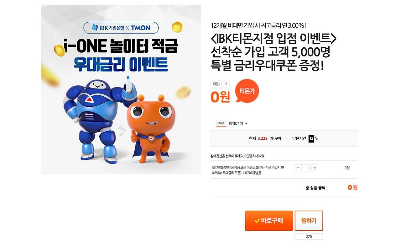 IBK기업은행은 최근 소셜커머스 티몬 내에 제1호 온라인 지점인 ‘IBK 티몬지점’을 열었다. 티몬지점에선 인터넷 쇼핑을 하듯 기업은행의 적금, 카드, 대출, 외화환전 등 금융상품과 서비스를 쉽게 살 수 있다. 기업은행은 티몬지점 전용상품도 출시할 예정이다. 티몬지점에서 ‘아이원(i-ONE)놀이터적금’을 가입하는 선착순 5,000명에겐 0.65%포인트의 특별금리를 제공하는 이벤트도 진행한다.