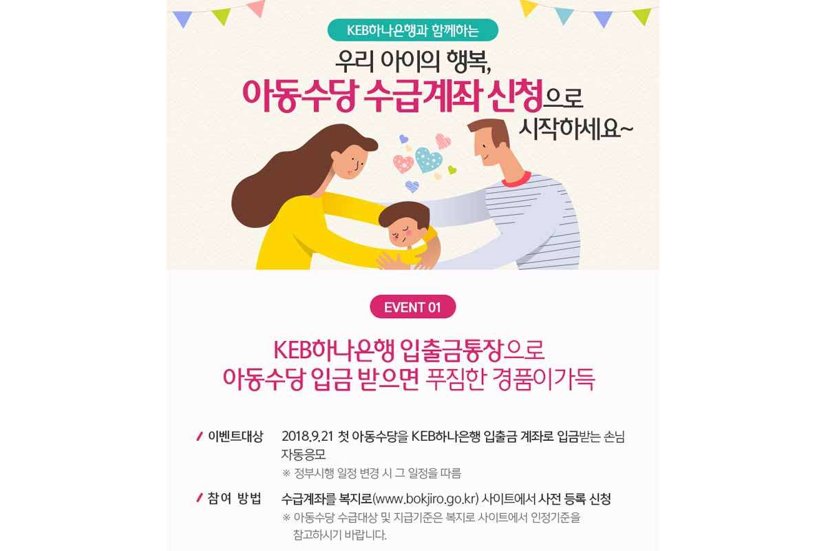 KEB하나은행은 또한 아동수당수급계좌 신청 이벤트도 진행하고 있는데, 2018년 9월 21일, 첫 아동수당을 KEB하나은행 입출금 계좌로 입금받는 경우 LG 트롬 건조기, 다이슨 청소기, 신세계 이마트 모바일 상품권 등 다양한 경품이벤트에 자동으로 응모된다. 또한 아동수당 수급계좌를 신청하고 이벤트 응모하기를 입력하면 경품 추첨을 통해 신세계 이마트 모바일 상품권 5천원권을 회차당 500명 추첨하여 제공한다.
