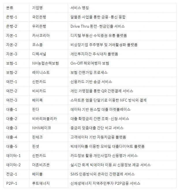 19개 서비스는 대출 5건, 보험 2건, 자본시장 3건, 여신전문금융 2건, 데이터 2건, 전자금융 1건, P2P(개인간 대출) 1건 등 분야별로 안배됐다.
