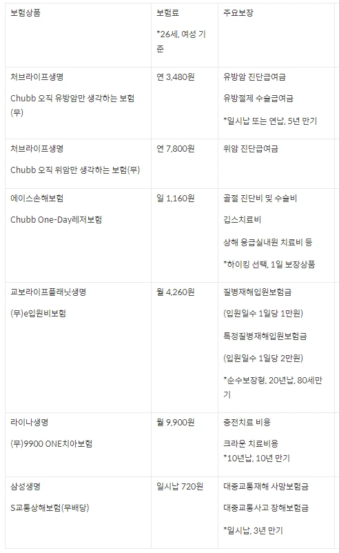 모든 암 종류를 보장하지 않고 유방암만 보장하는 보험, 스포츠를 즐기다 발생할 수 있는 배상책임을 보장하는 보험 등이 그러한 상품의 예시입니다. 보험료는 몇천 원에서 1만 원 수준으로 아주 저렴한 축에 속합니다.