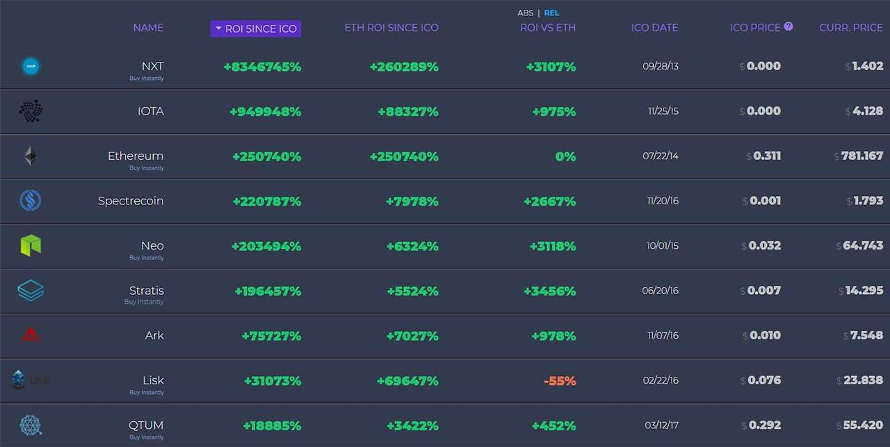 2017년 12월 27일 기준 ICO 가격 대비 수익률이 가장 좋았던 코인은 NXT, IOTA, Ethereum, Spectrecoin, NEO 순이고, 이더리움 수익률 대비 수익률이 가장 좋았던 코인은 Populous, Stratis, Neo, NXT 순이다.