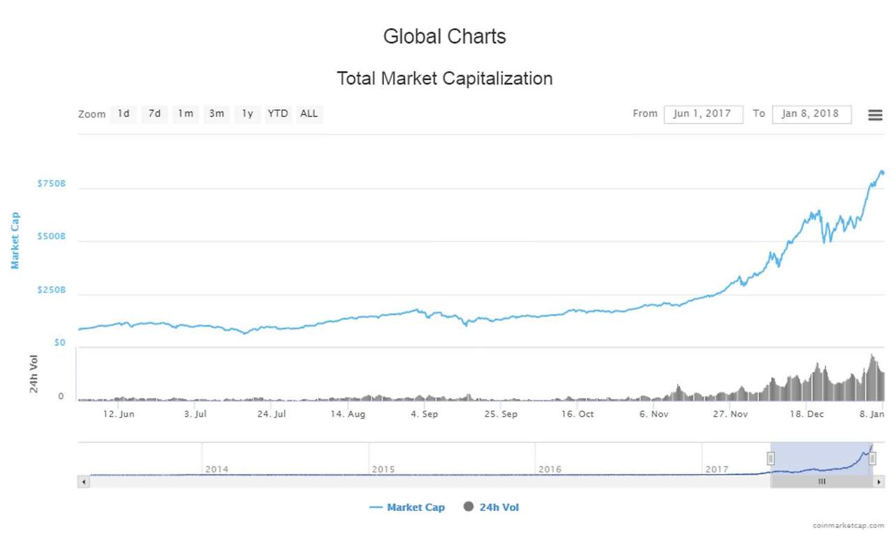 '코인마켓캡(coinmarketcap.com)'은 암호화폐에 투자하고 있다면 참고해야 하는 사이트 중 하나다. 코인마켓캡은 코인 시세와 차트뿐만 아니라, 암호화폐 시장의 시가총액과 거래량, 각 코인 공급량, 거래량, 시가총액 등을 제공한다. 또한, 특정 코인의 홈페이지와 어느 거래소에서 얼마만큼의 거래가 이루어지는가도 파악할 수 있다. 참고로 암호화폐 시가총액은 2017년 1분기말 약 28조 원, 2분기말 약 110조 원, 3분기말 약 150조 원, 4분기말 약 660조 원을 기록했으며, 2018년 1월 8일 기준 암호화폐 시가총액은 약 868조 원을 기록하고 있다.